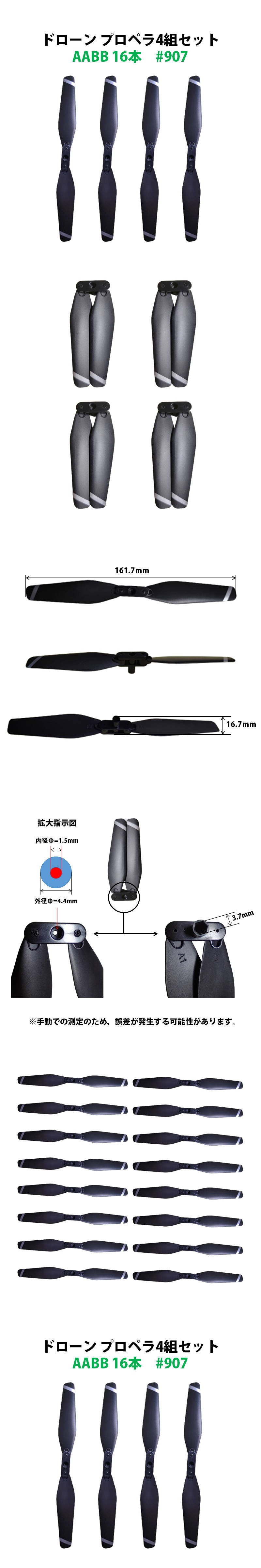 | hyzpp907内容物:汎用プロペラ4セット。AABB合計16枚です。※寸法の詳細は商品図をご参考ください。※ご購入前に穴直径をご確認ください。 |