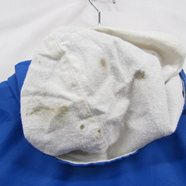 ・左袖のリブにダメージ穴があいており、フード裏には汚れが見られます。