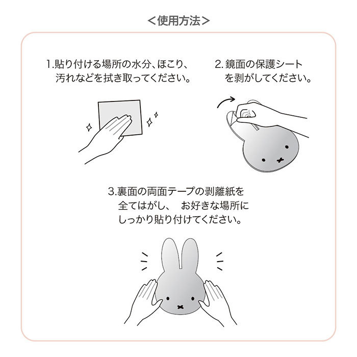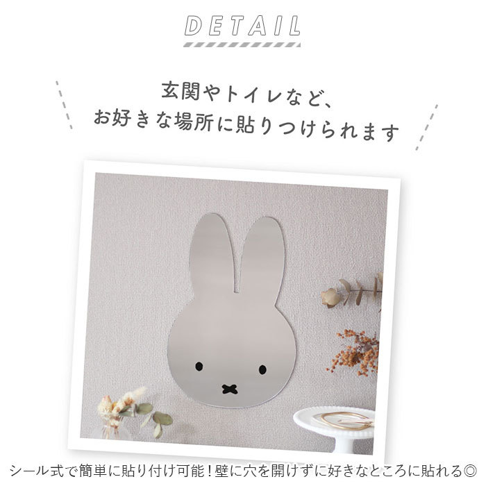 | 商品説明 | ・・人気キャラクター「ミッフィー」の顔がダイカットされた壁に貼れるインテリアミラー。 ・シール式で簡単に貼り付け可能!壁に穴を開けずに好きなところに貼れる◎ ・オフィスのロッカーやクローゼットの扉の裏側など、どんな場所にも簡単セッティング。 ・重さはわずか約58g!軽量なアクリル製ミラーだから、もしもの時に落下しても割れにくく、小さなお子さまのいるご家庭でも安心。 ・シンプルなデザイン&ミッフィーのほっこりした表情がインテリアのアクセントに。 ・お好きな場所にペタッと手軽に貼って、空間をパッと明るく華やかに。 |
