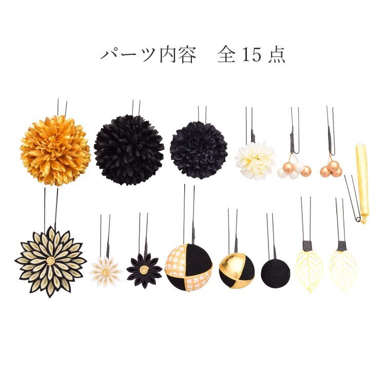 商品内容 | 髪飾り全15点 大花×1(花径6cm) 小花×2(花径3cm) マム大×2(花径6cm) マム中×1(花径5cm) マム小×1(花径3.5cm) ちりめん玉大×1(玉径4cm) ちりめん玉中×1(玉径3cm) ちりめん玉小×1(玉径2.5cm) 実玉5粒×1(玉径1cm) 実玉3粒×1(玉径1cm) 葉×2(縦幅4.5cm、横幅2.5cm) タッセル×1(長さ7.5cm) |