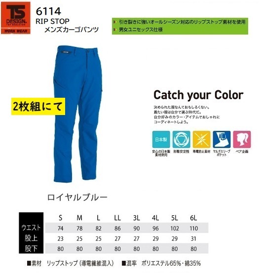 ビックイナバ特価◆TSDESIGN 6114 RIP STOPメンズカーゴ【41ロイヤルブルー・6Lサイズ】定価1枚8360円の品が、2枚組で即決2980円