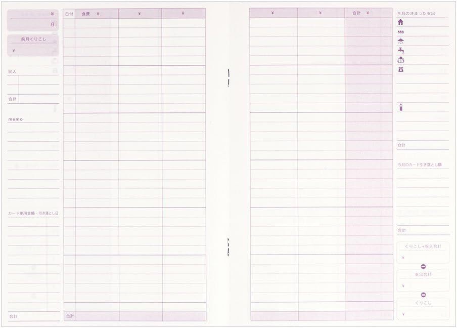 支出項目はあらかじめ食費のみが印刷されており、残りの項目はライフスタイルや用途に合せて自由に設定することができます。支出があったときの日付と、内容、金額を記入していくだけなのでとても手軽です。見開き1ページで1ヵ月分として使用できます。
