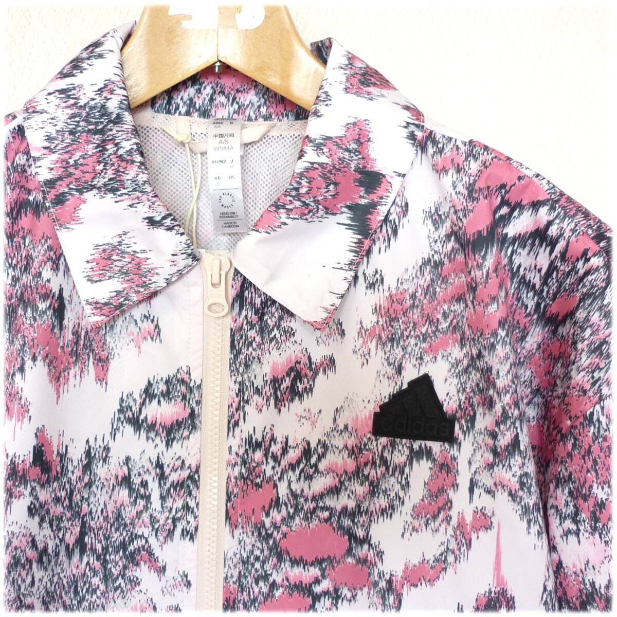 ポリエステル100%のレディース ウィンドブレーカーメッシュの裏地付き両サイドにポケットあり裾に絞り紐胸元にロゴマーク・肩から背中にかけて黒の3ストライプレディースMサイズですがゆったりしているのでユニクロのM~L着用で充分着られると思います