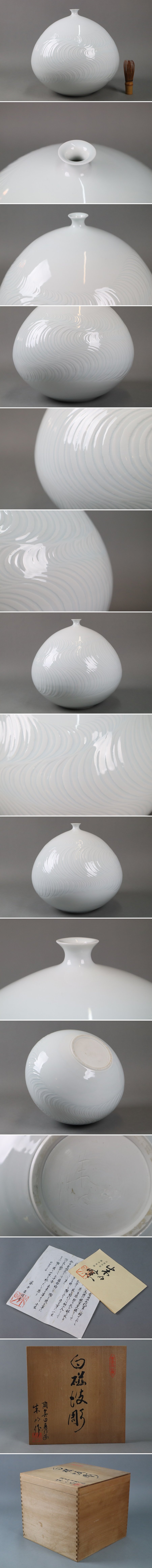 【陶芸日展作家名工 藤井朱明 白磁波彫 花瓶 高28,5cm 共箱】