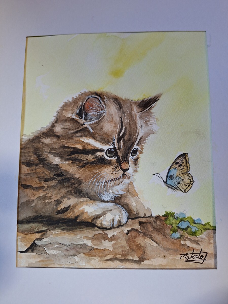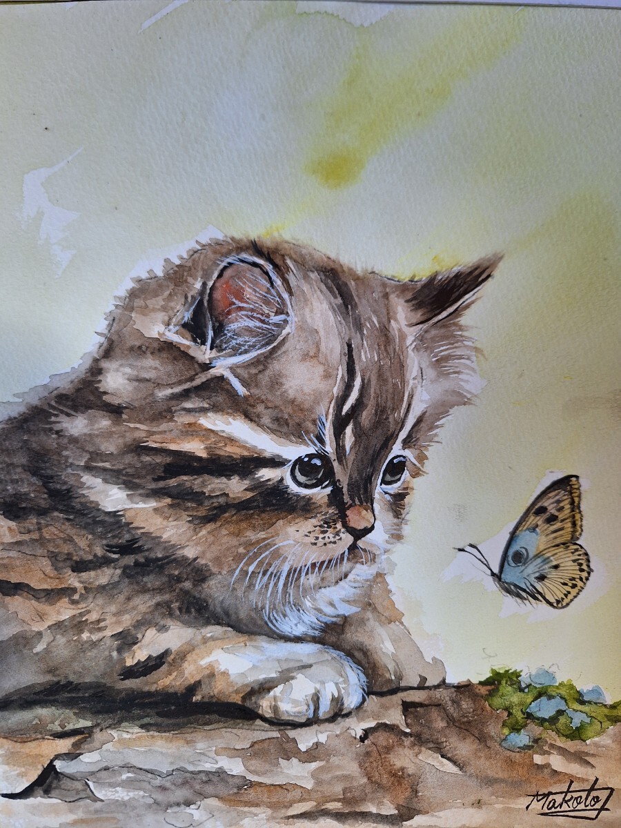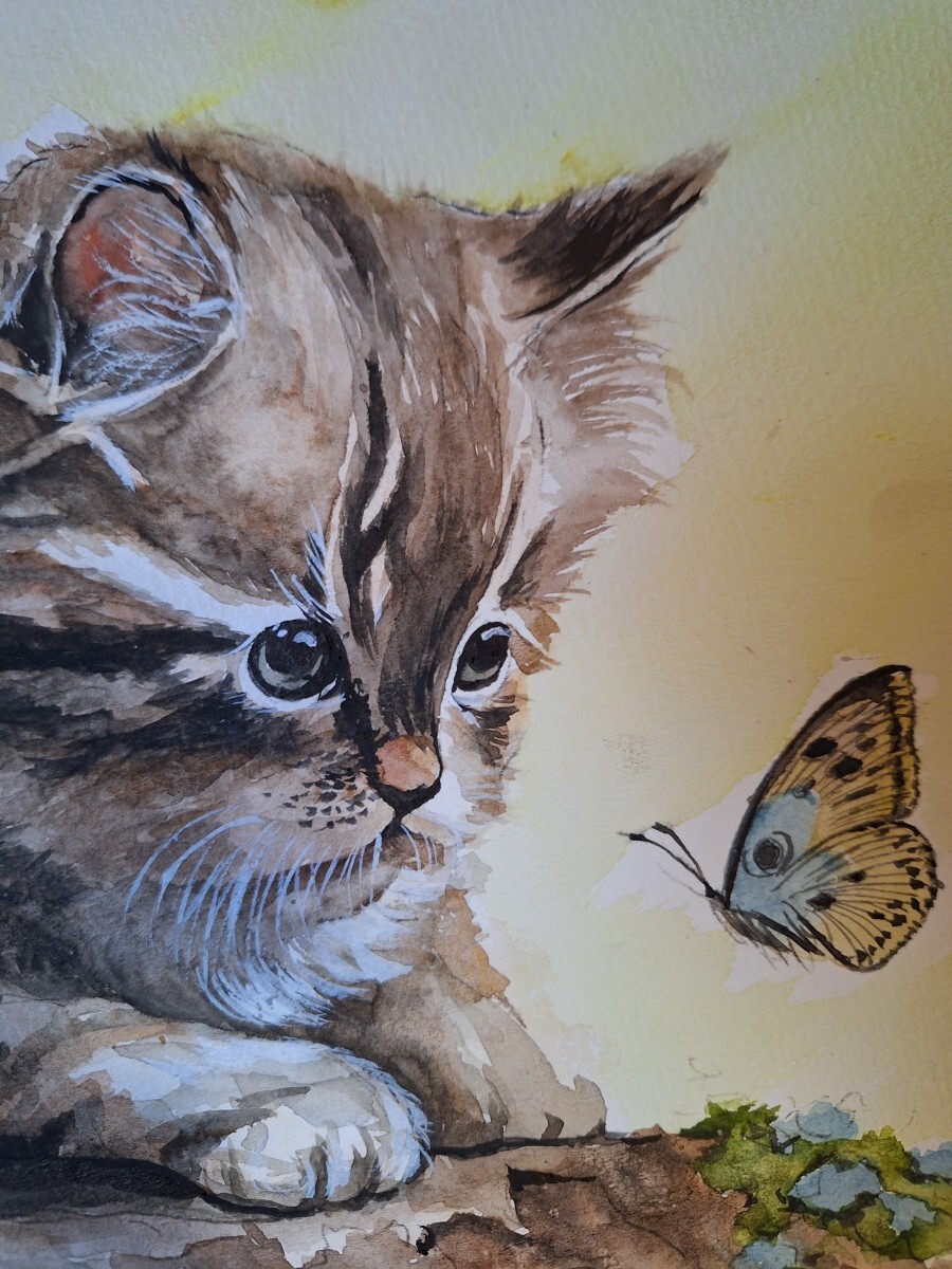 チョウと遊び戯れ見つめ合う可愛い子猫ちゃんを水彩画で描きました。