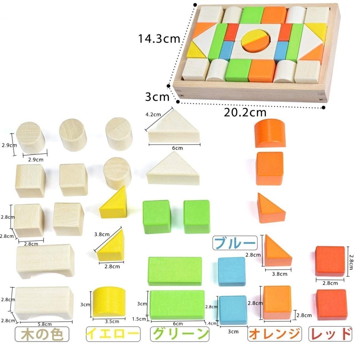 *素材* 欅木 *サイズ* 56 PCS:30 X 23.8 X 4.5 cm 28 PCS:21.2 X 15 X 4.5 cm *重さ* 56 PCS:1558g 28 PCS:686g *対象年齢* 3歳から *商品説明* 無垢の木の木肌そのものの色と無毒の4種類の色、全てのピースの角が「面取り」されているので、赤ちゃんや子どもの小さな手にもなじむやさしい手触りです。 身の回りのものを積み木に見立て、代用して遊ぶことで想像力、創造力、工夫する力、発想力などを育みます。さらに、4種類の色があり、色の認識を育ちます。 積み木遊びから空間図形を把握する力が育ちます。目に見えないものを立体的に捉える能力は、運動能力や理系の分野で大きく生かされます。 木箱は、パズルのように積木の形を合わせて詰める遊びもできます。 また、お片付け箱として片付けの練習にもぴったりで、出産や誕生日の贈り物におすすめです。