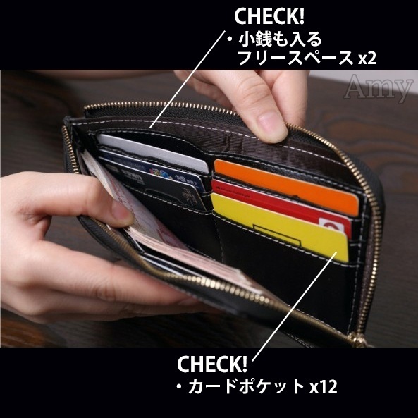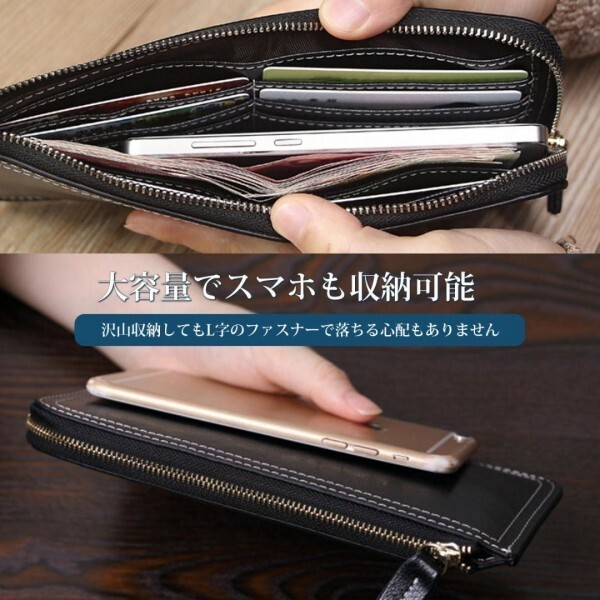 L字ファスナーだから、マチがなくても一目で見やすく、さらに真ん中部分も収納スペースとして使用できます。ちょっとした食事や買い物の際はスマホも収納し、お財布だけでOK。