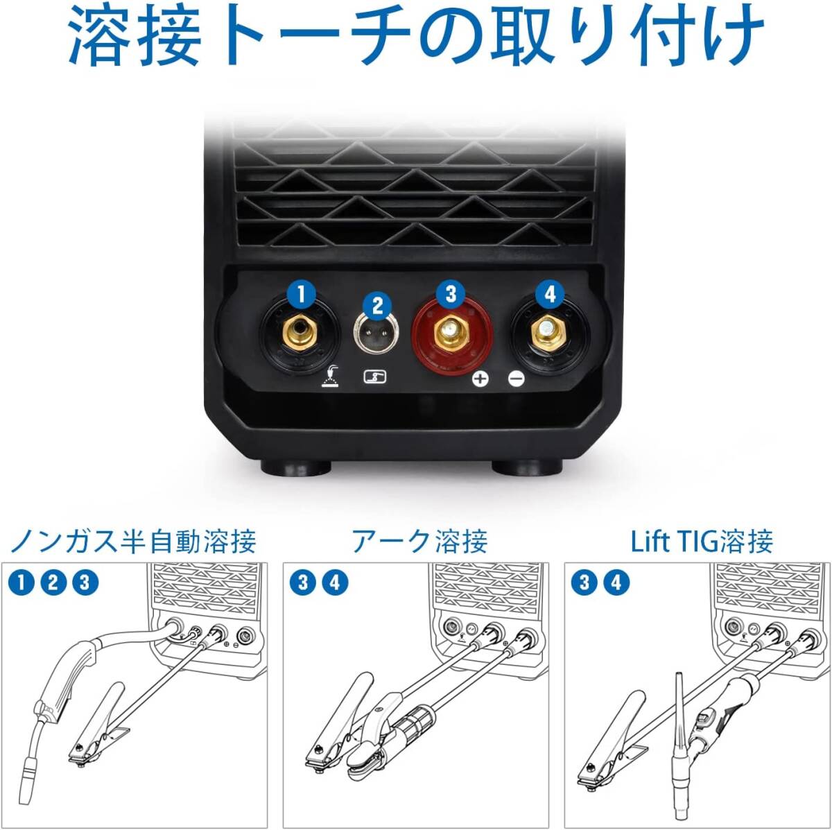 ノンガス半自動溶接以外にも、アーク溶接とLift TIGも使用可能で小型軽量インバータノンガス半自動溶接機。
