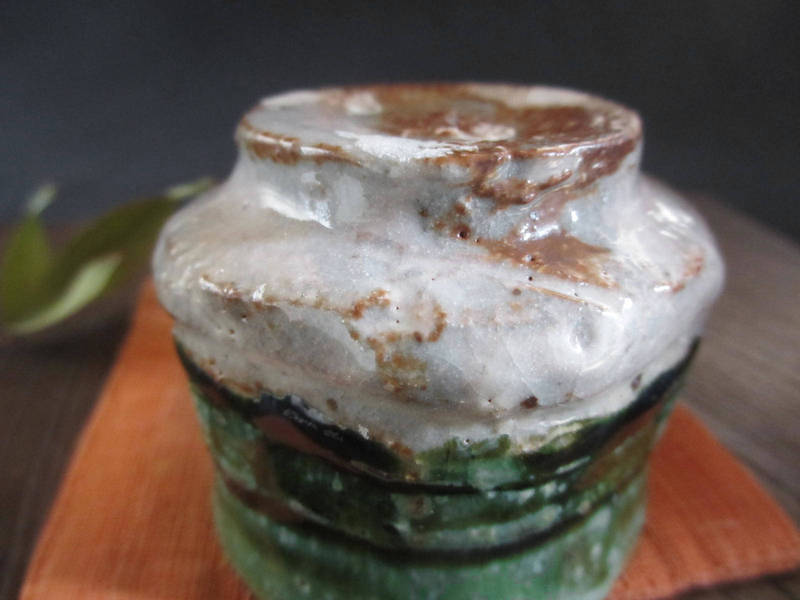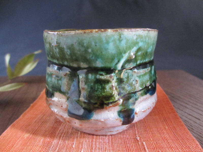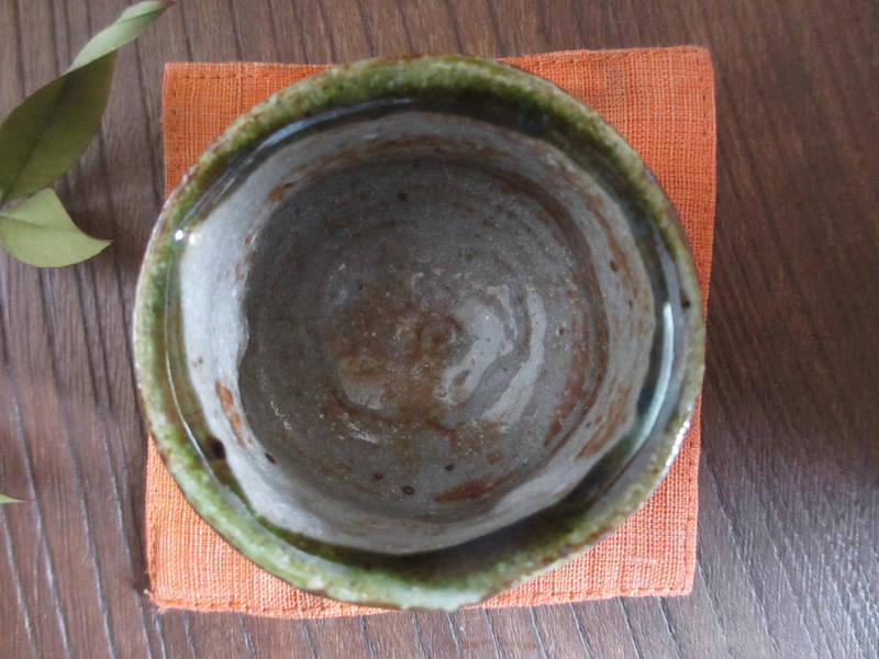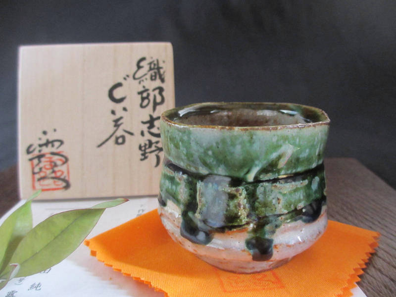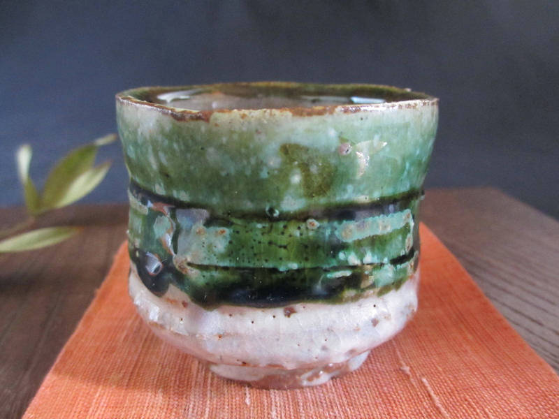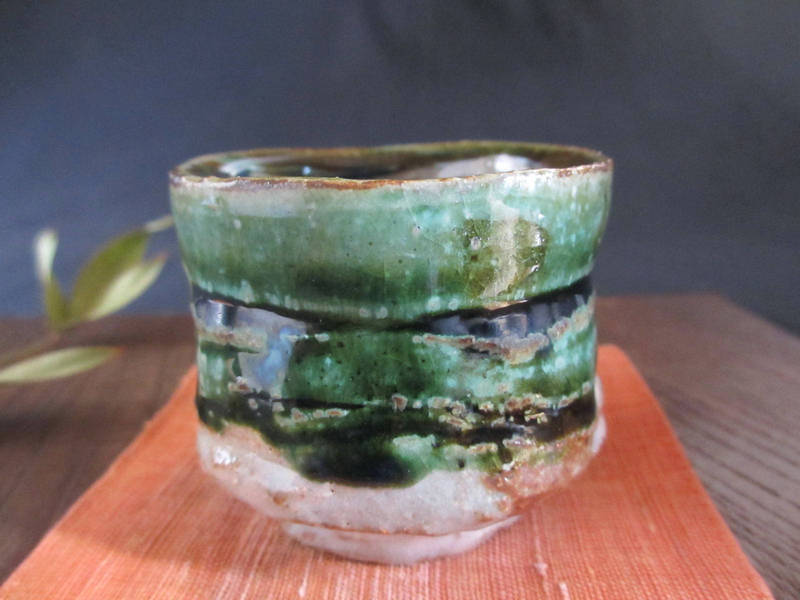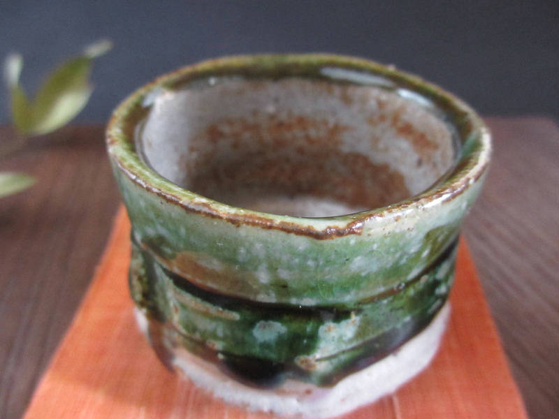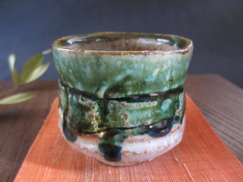 荒々しく削り落とし、織部釉と志野釉を掛けた味わいのある個性的なぐい呑み。表面には濃淡のある織部釉に鉄分が混ざり、奥深い緑色に焼かれています。