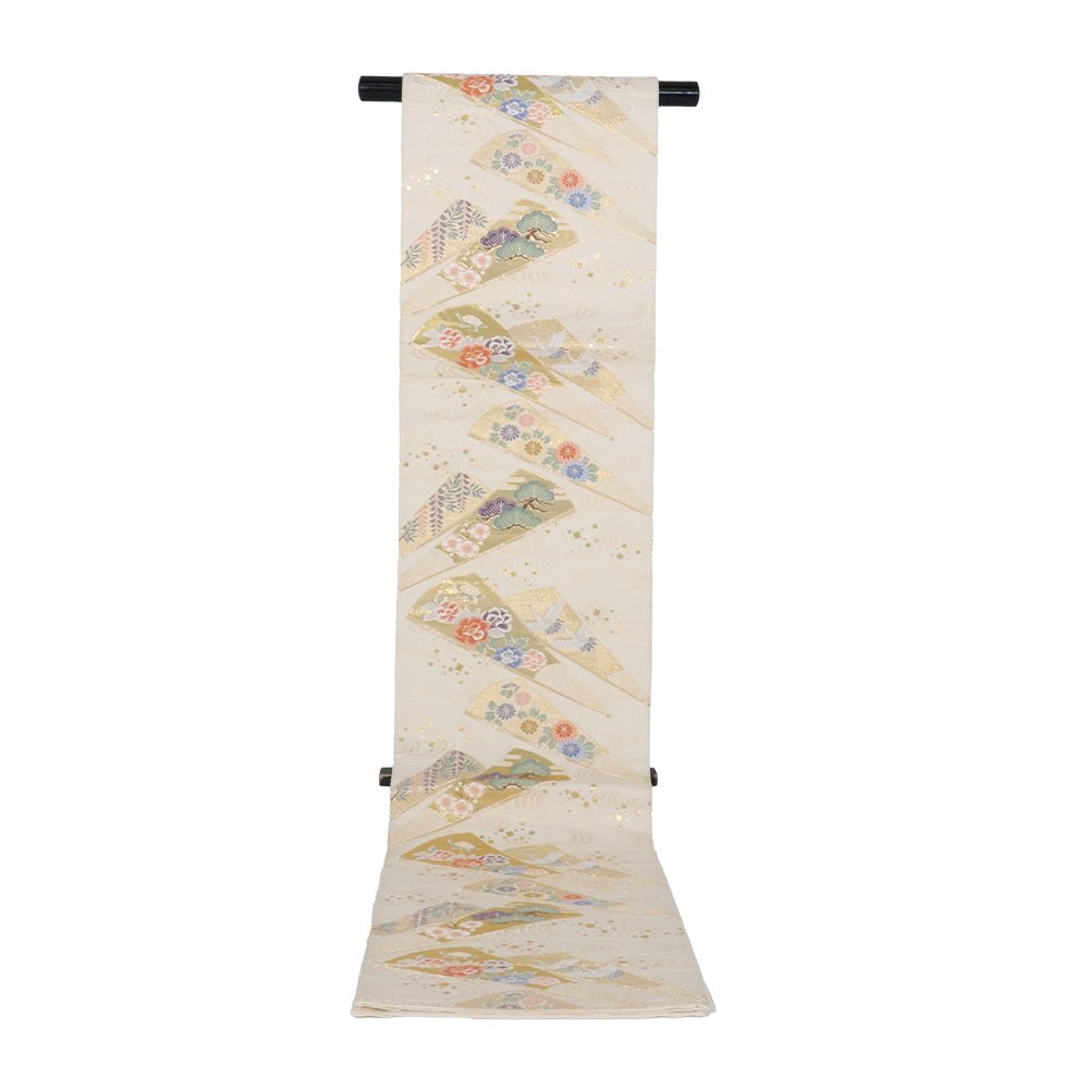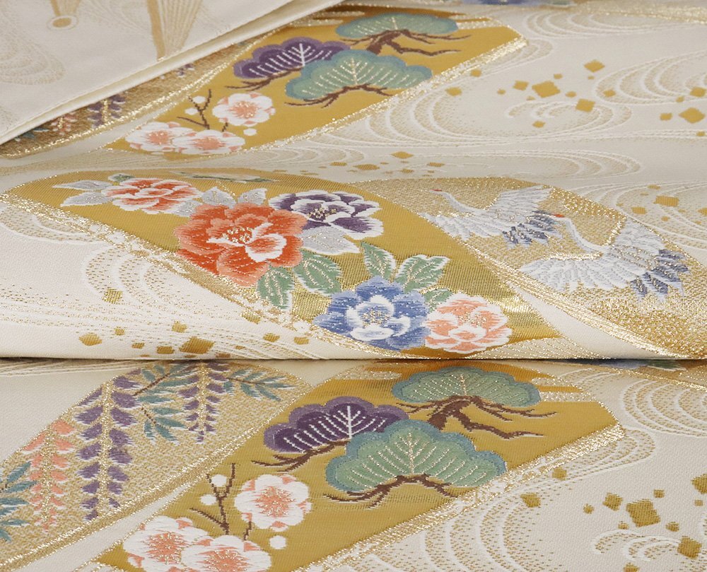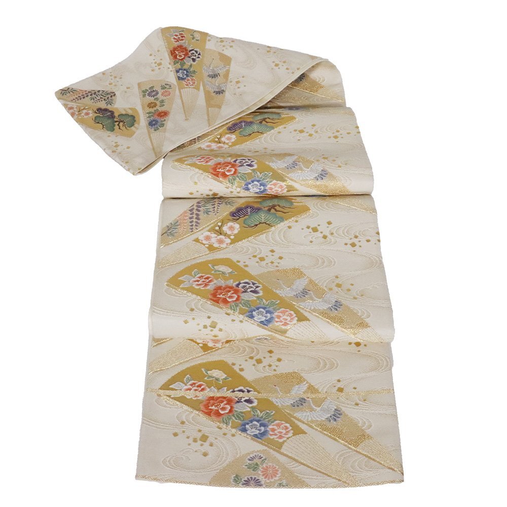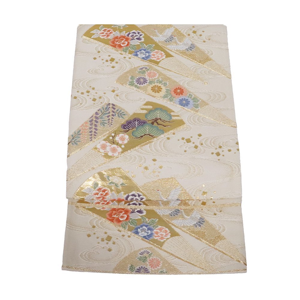 | 西陣織袋帯 ベージュ・金地 扇子文 鶴・松竹梅・菊・牡丹・藤 未使用品 仕立て上がり | |