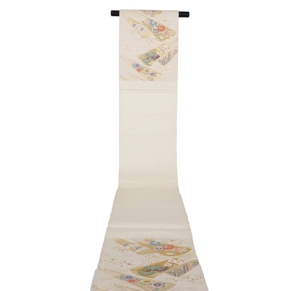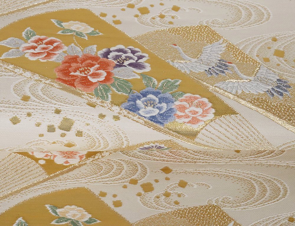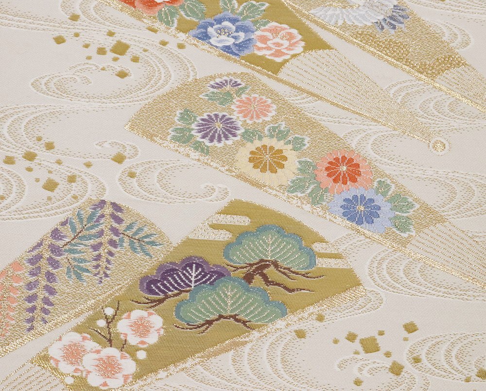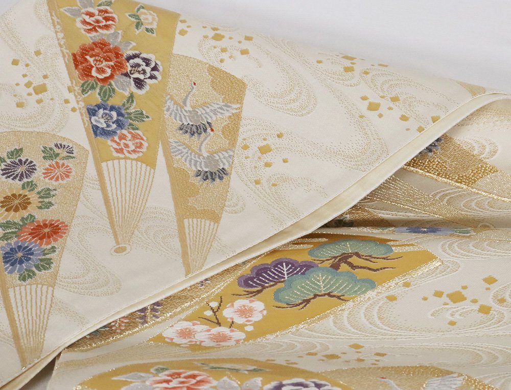 | 西陣織袋帯 ベージュ・金地 扇子文 鶴・松竹梅・菊・牡丹・藤 未使用品 仕立て上がり | |