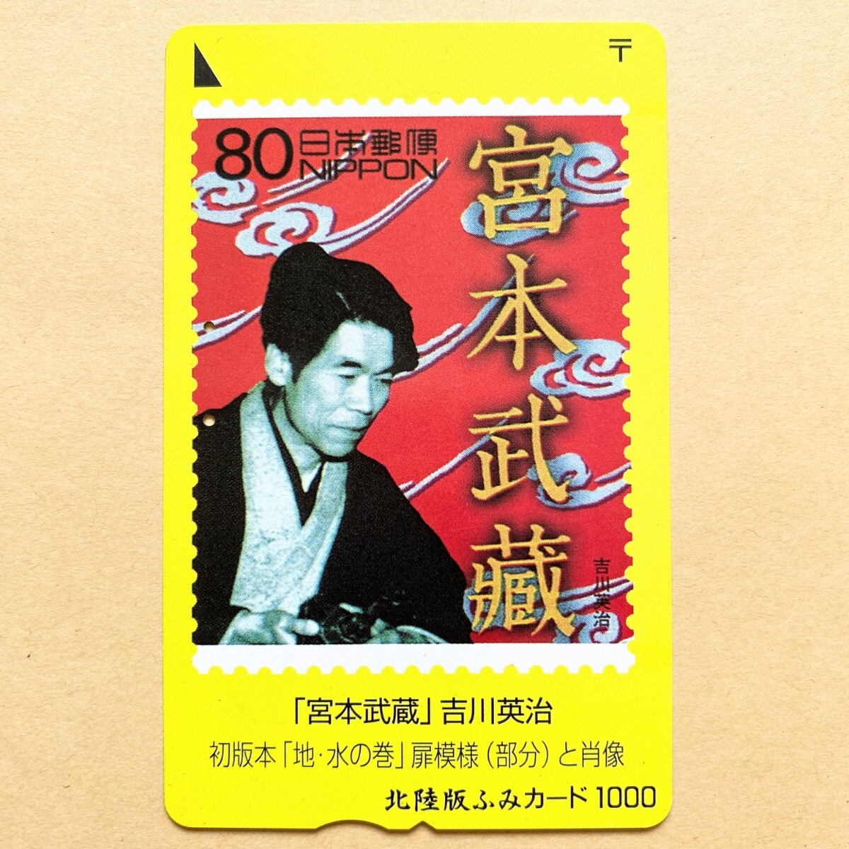 【使用済】 ふみカード 北陸版 「宮本武蔵」吉川英治 初版本「地・水の巻」扉模様(部分)と肖像