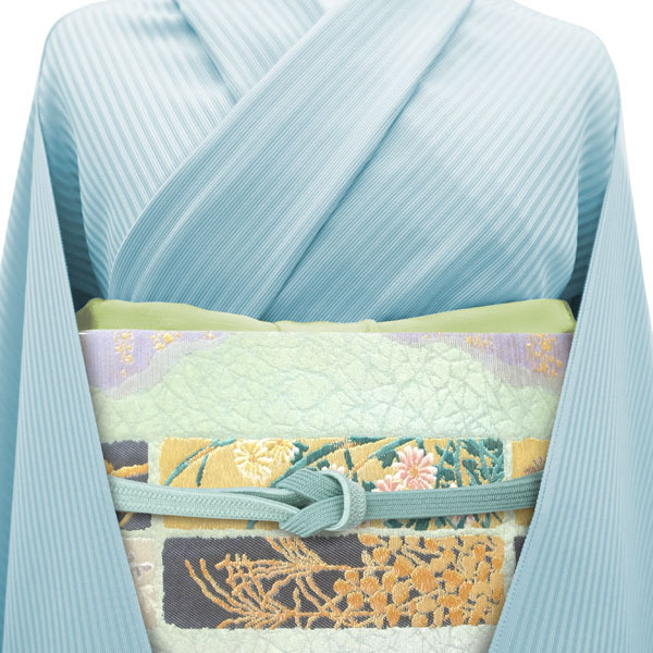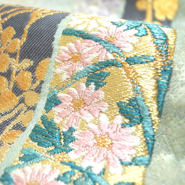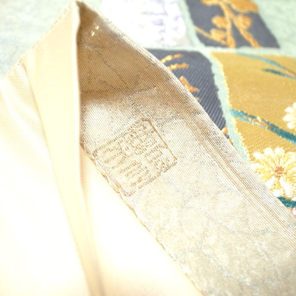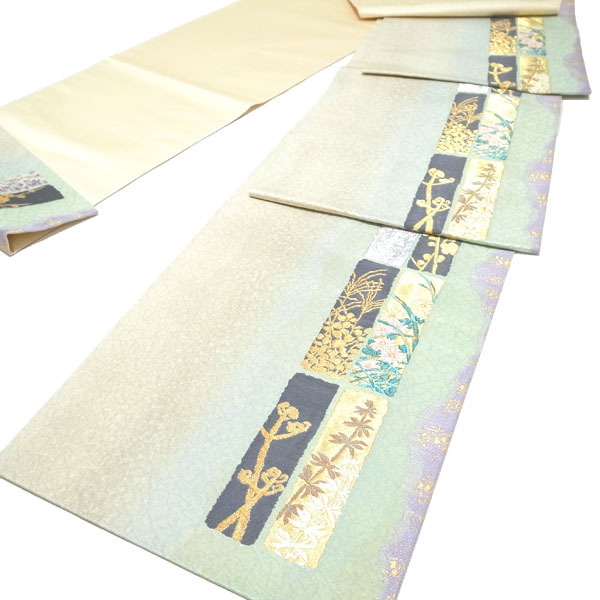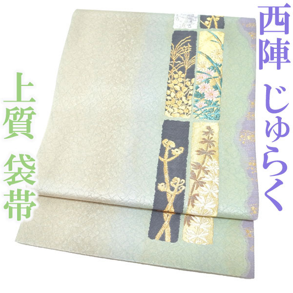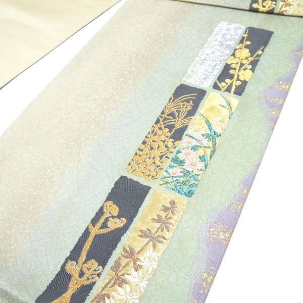 袋帯 京都 西陣 じゅらく 落款有り 薄緑 ベージュ 金銀糸 短冊 菊 梅 藤 わらび すすき 上質な織り 春 秋 冬 おしゃれ オシャレ お洒落 上質 正絹 絹 フォーマル 結婚式 七五三 入卒式 などに 美品 きれい キレイ 綺麗 未使用品 未使用 なごみ 新古品 仕立て上がり品 kp1385
