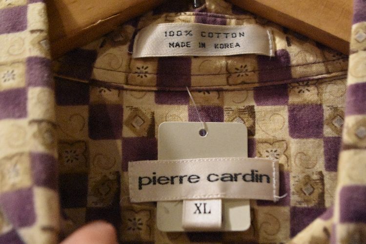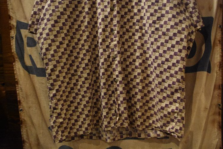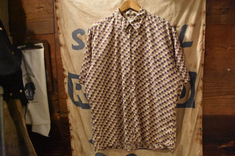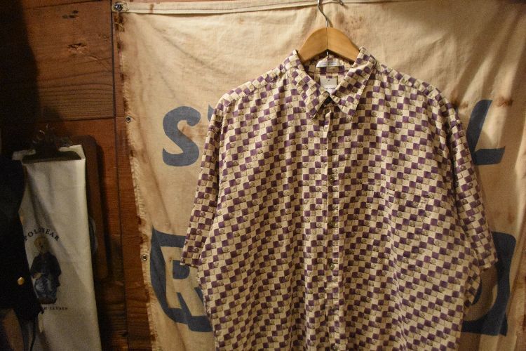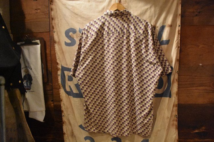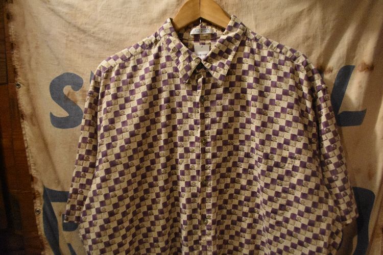 グッドカラー◎90sビンテージpierre cardinピエールカルダン半袖総柄チェックシャツXLパープル紫×生成り系アメカジストリートn24200