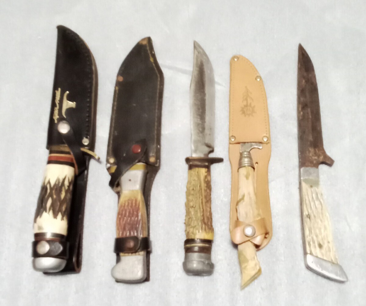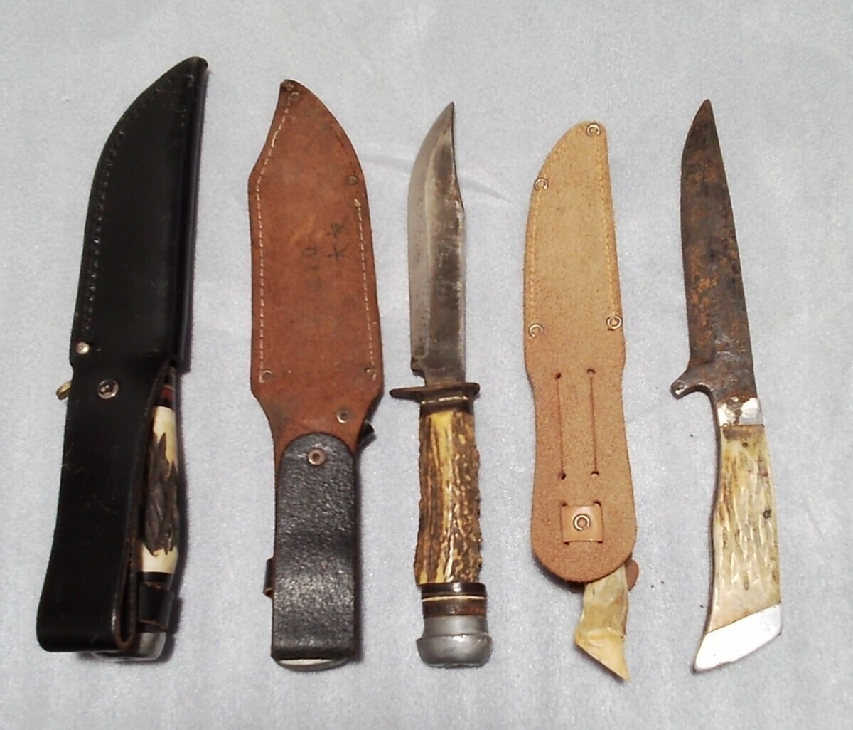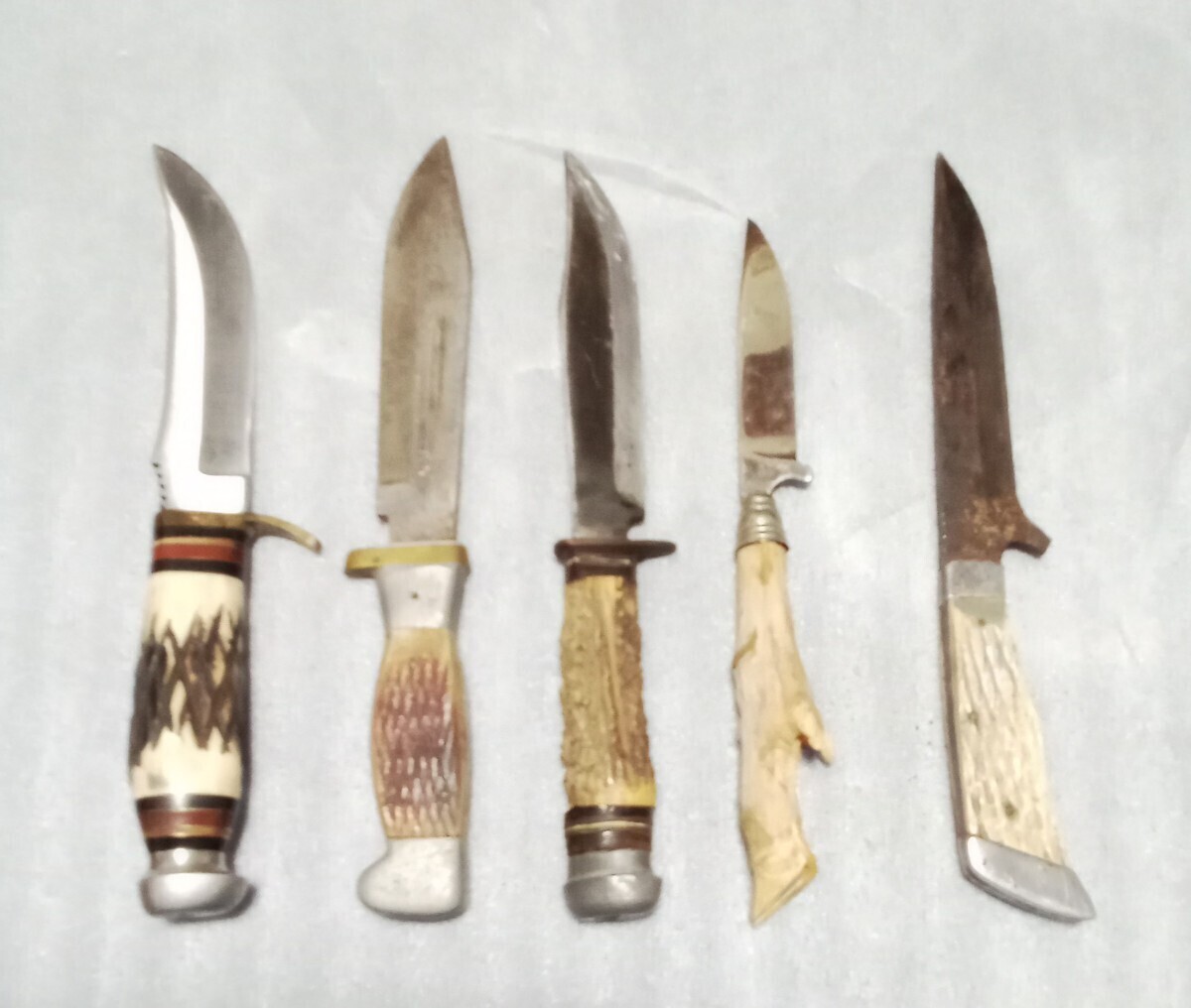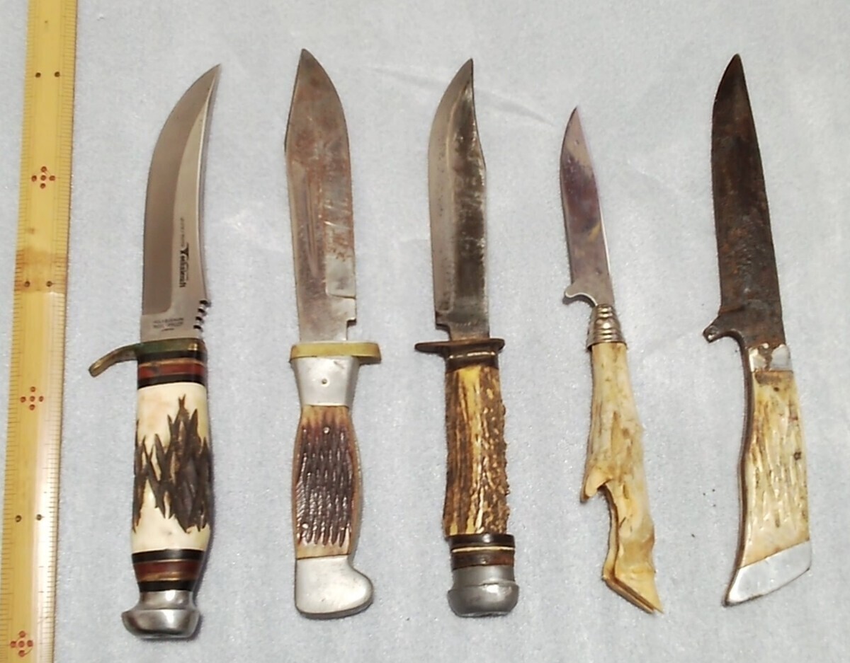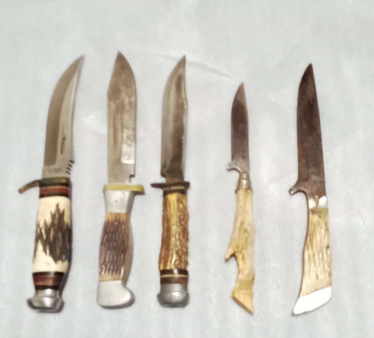 ★サイズ★写真参照 蔵出しのハンティングナイフ五本です。錆び身で写真一枚、左と真ん中のメーカー名記載有り。右から2本目の柄のアップ写真最終に記載。写真参照。出て来たままでのお引き渡しです。写真を見て御納得の上にて御入札下さい。