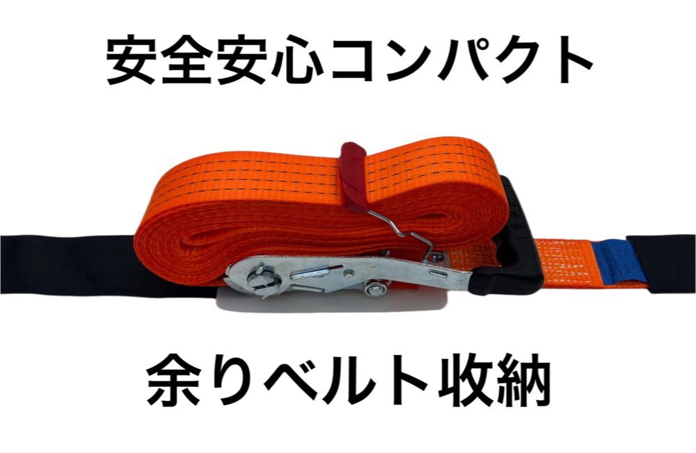 最新荷締機ラッシングベルト:日本国内実用新案登録済。ベルト収納式ラチェット荷締機では、荷物固定後に、巻取側の余分ベルトが収納できるようになります。思わぬ事故を防ぐことができます。運送物流業界でラチェット式荷締機が広くご利用にあたって、安全対策の一環として効果が発揮します。