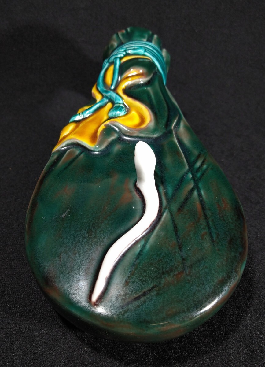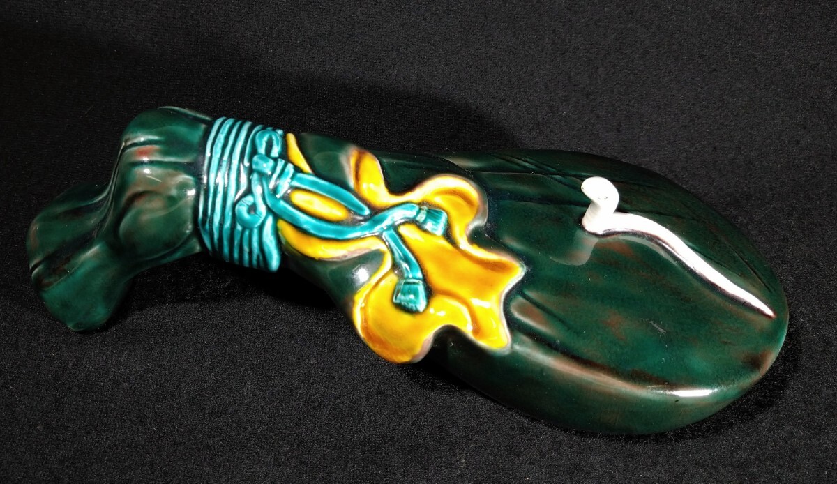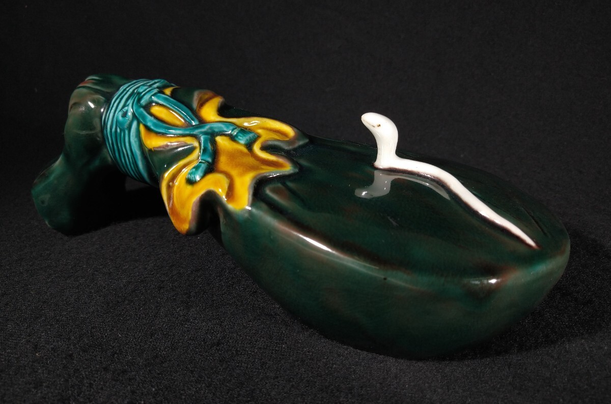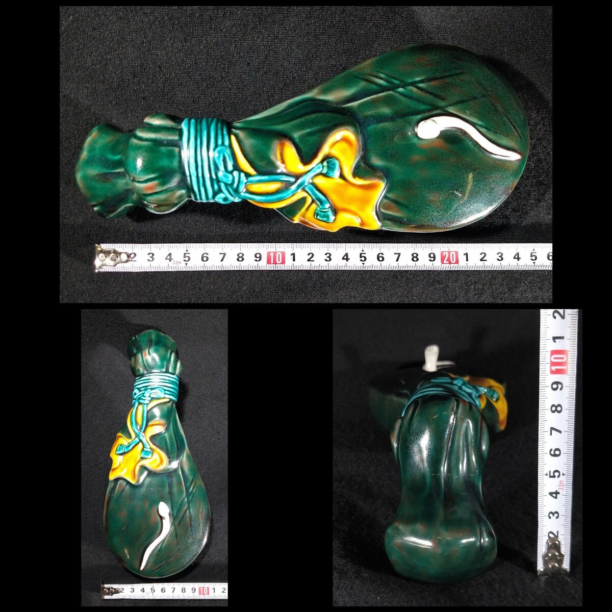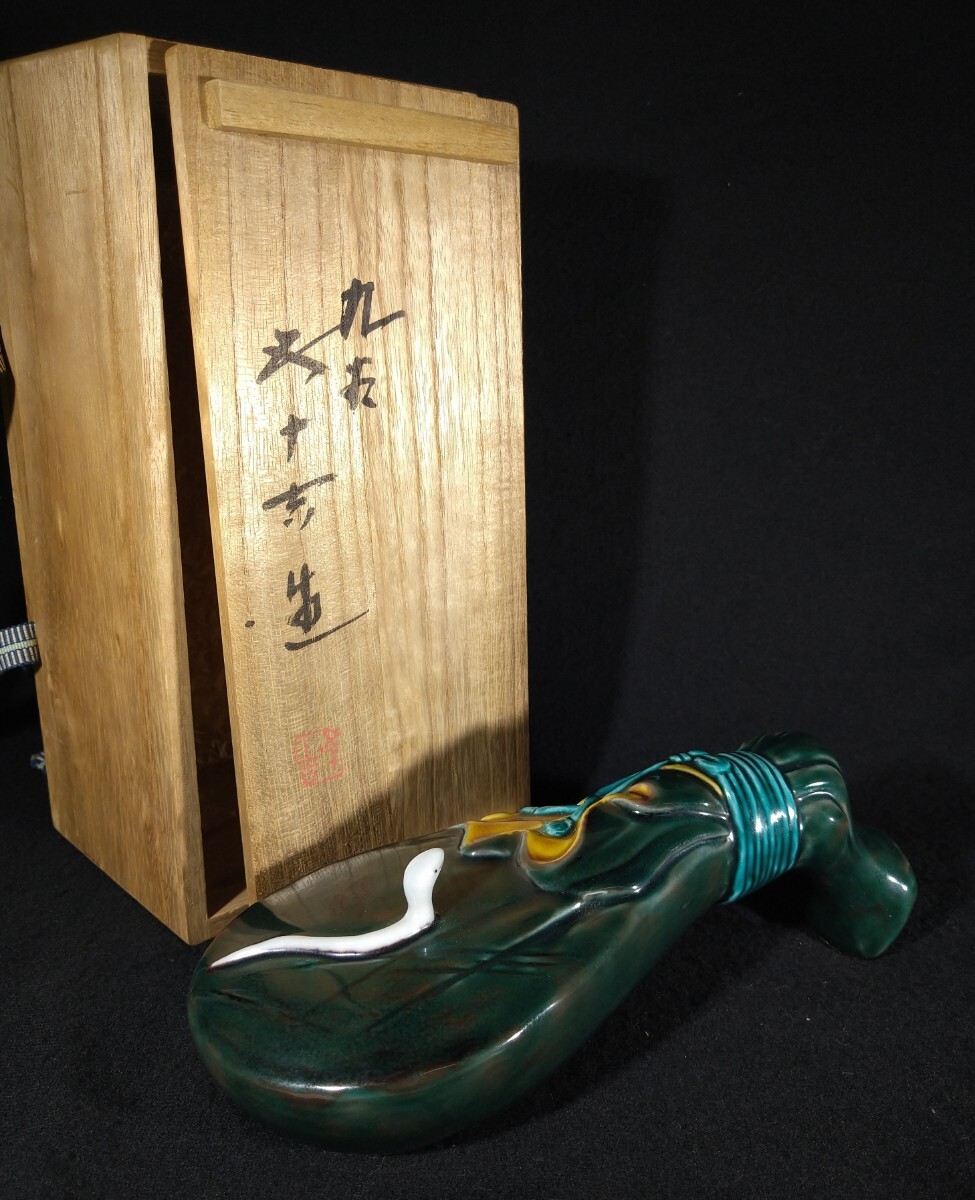 深みのある緑と橙色の宝袋に、透明感のある白蛇が静かに這い寄る、浅蔵五十吉先生の美しい置物でございます。素人採寸で申し訳ございませんが、幅24.7cm、10.2cm、高さ8.2cmでございます。