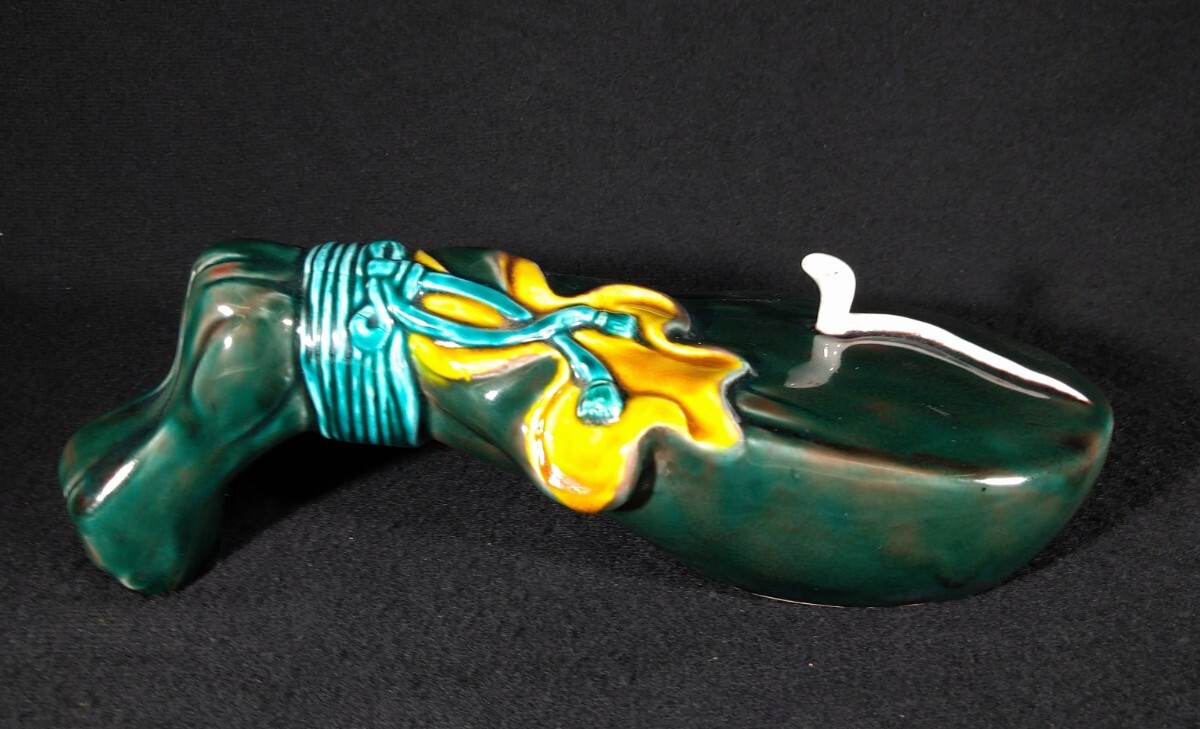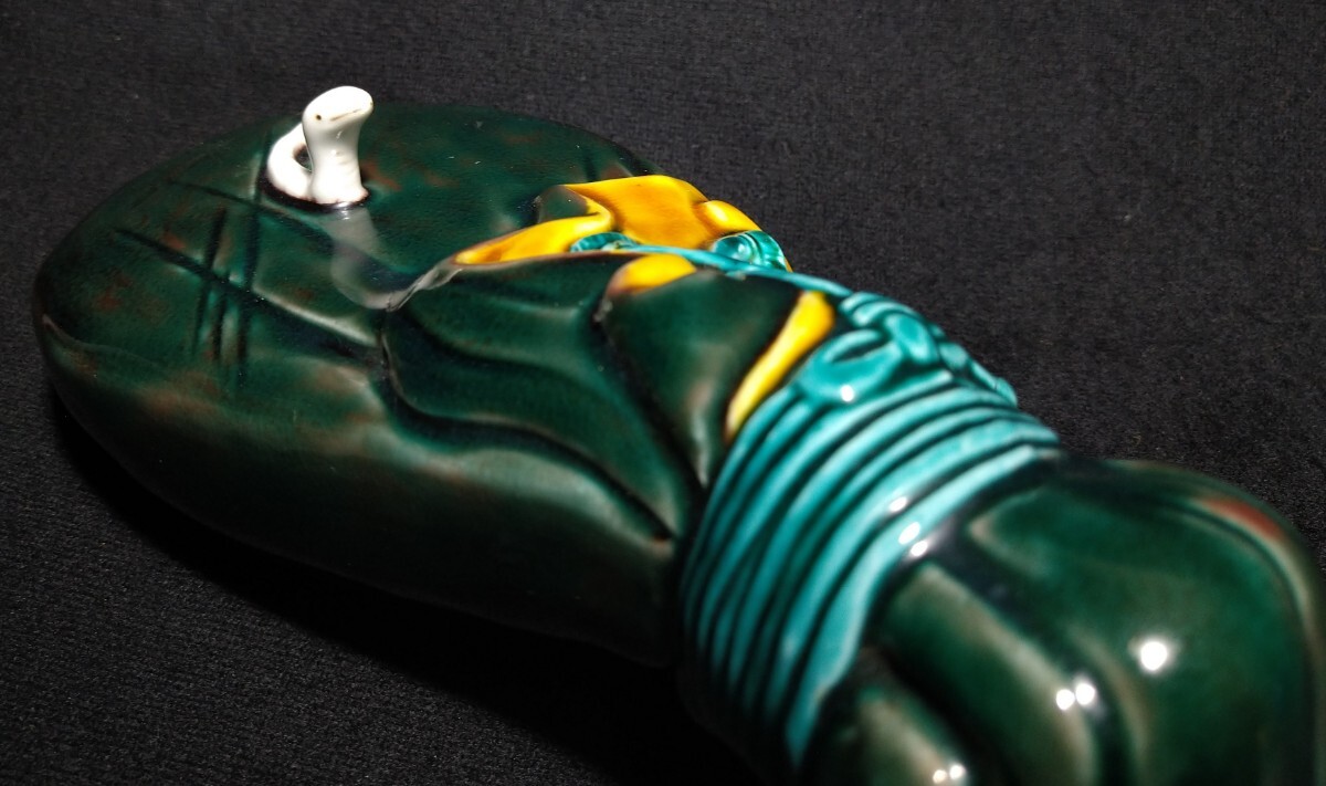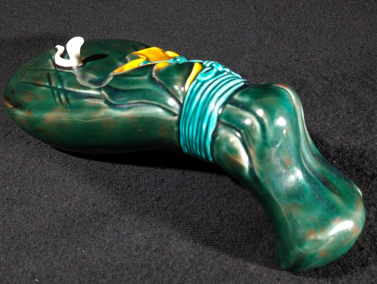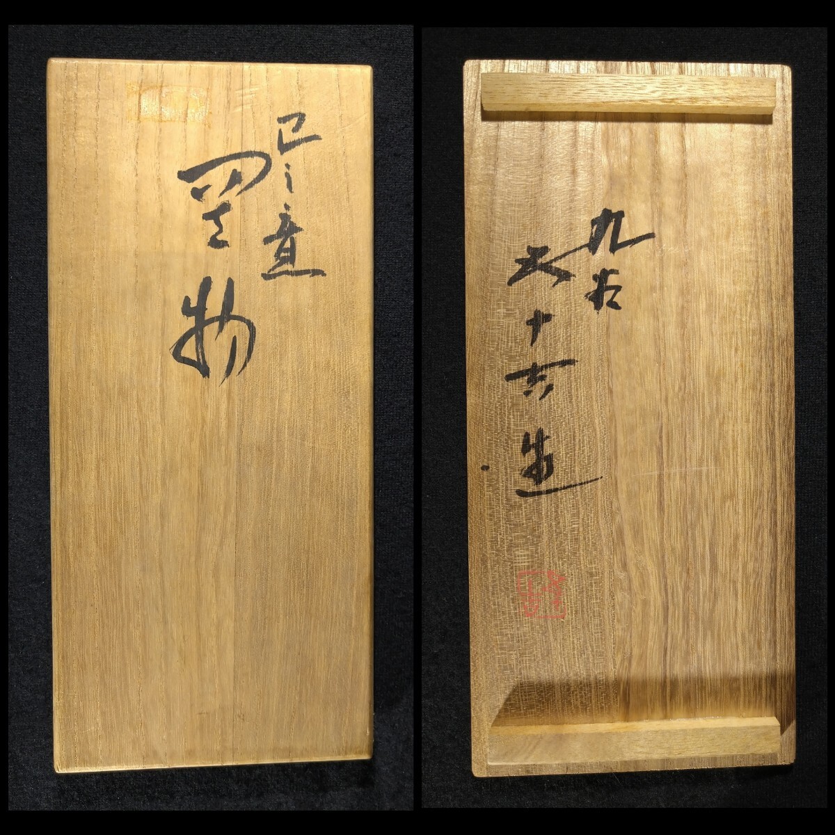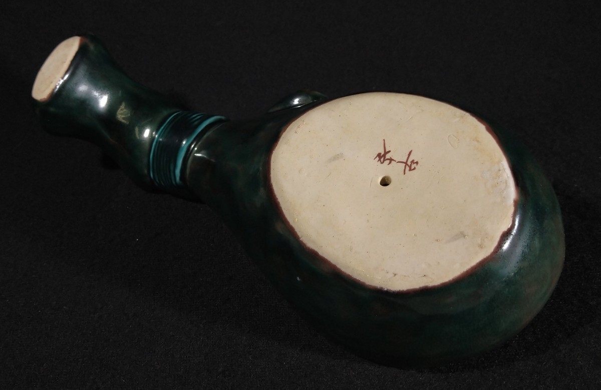 深みのある緑と橙色の宝袋に、透明感のある白蛇が静かに這い寄る、浅蔵五十吉先生の美しい置物でございます。素人採寸で申し訳ございませんが、幅24.7cm、10.2cm、高さ8.2cmでございます。