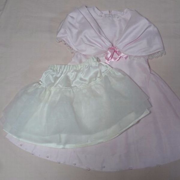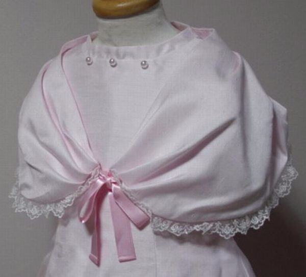 ティアードタイプのペチコートと裾に並んだパールが華やかなスカートラインを描き、レース飾りのケープが気品ある上品さを添えています。