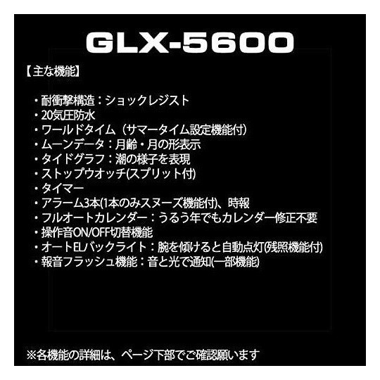 機能1 耐衝撃構造、20気圧防水機能/ワールドタイム:世界48都市(28タイムゾーン)の時刻表示、3都市同時時刻表示サマータイム設定機能付き/ムーンデータ/タイドグラフ/ストップウオッチ/タイマー2本 セット単位:1分、最大セット:24時間、1秒単位で計測/ マルチアラーム3本