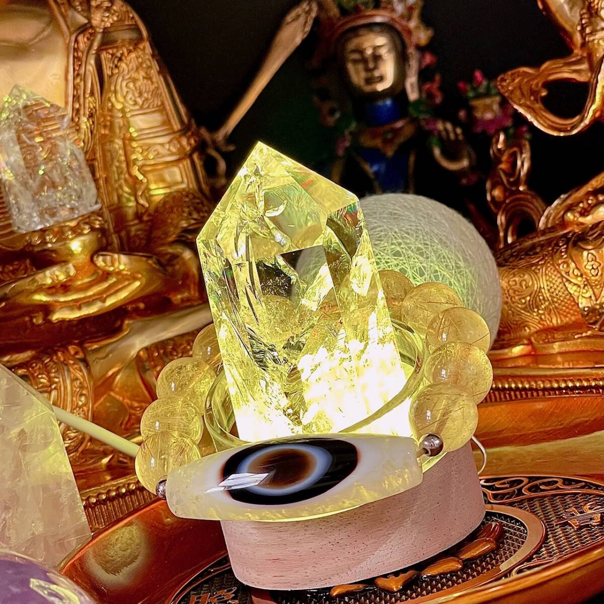 チベット天珠の中でも最強の力を持つと伝わる大天眼の水晶共生天珠と、金銭と勇気の象徴 太い針も見える天然ゴールドルチルクォーツを配置した最高級 天然石ブレスレット。持ち主に金運を呼び、悪意あるものを寄せ付けない力を感じる大人気の天然石ブレスレットです。