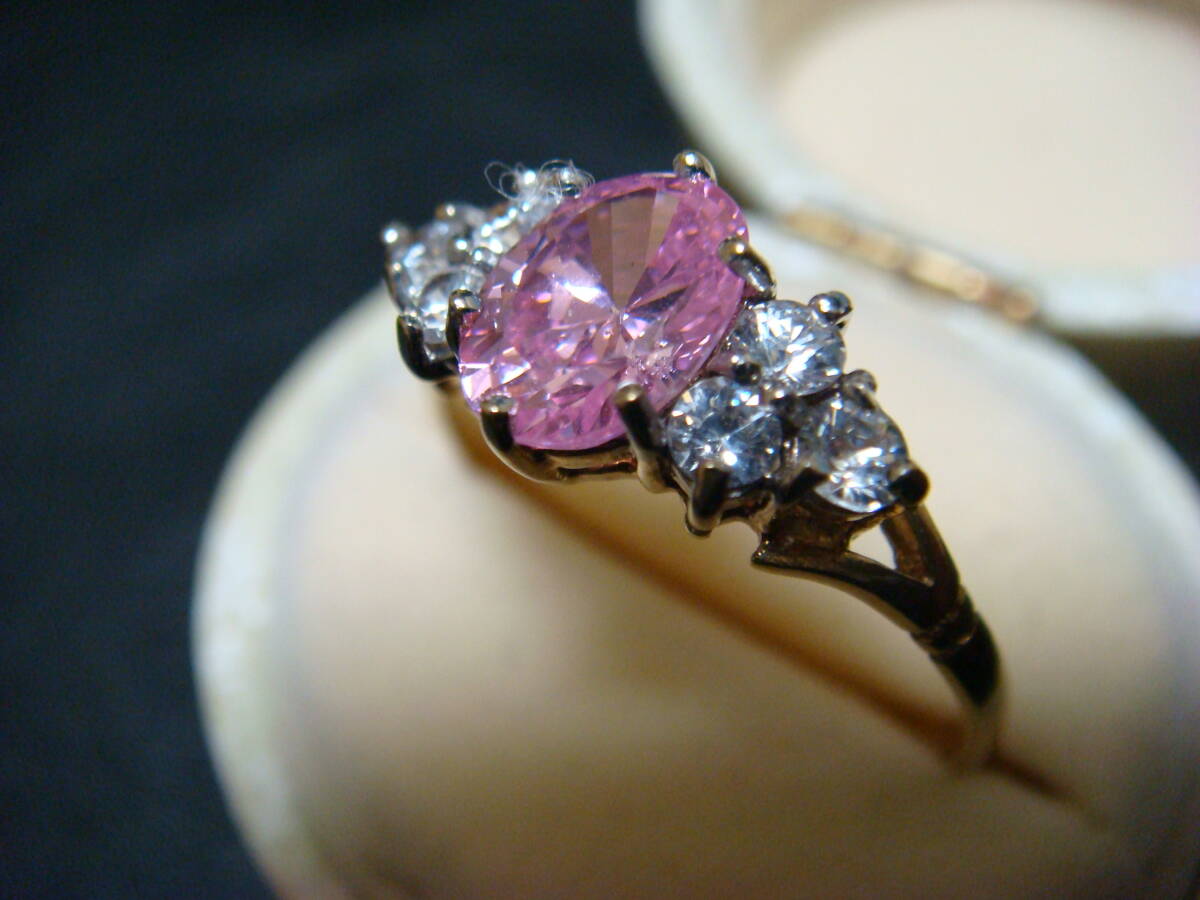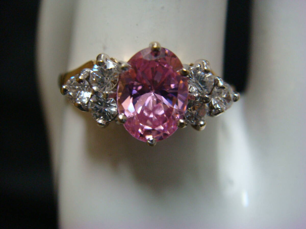 透明の石はダイヤモンドではありません。ピンク色の石は合成石と思われます。