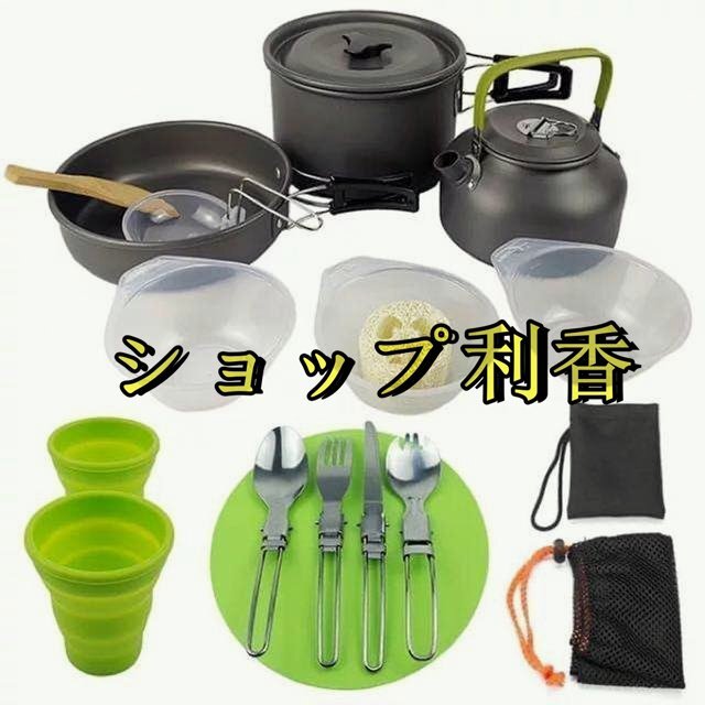 鍋*1,フライパン*1,やかん*1,木製シャベル*1,食品レベルPPお碗*3,スポンジ*1,PPカッティングボード*1,水カップ*2,スプーン*1,テーブルナイフ*1,フォーク*1,ナイフとフォークスプーン*1,小さな布バッグ*1,メッシュバッグ*1