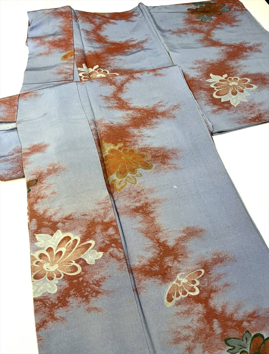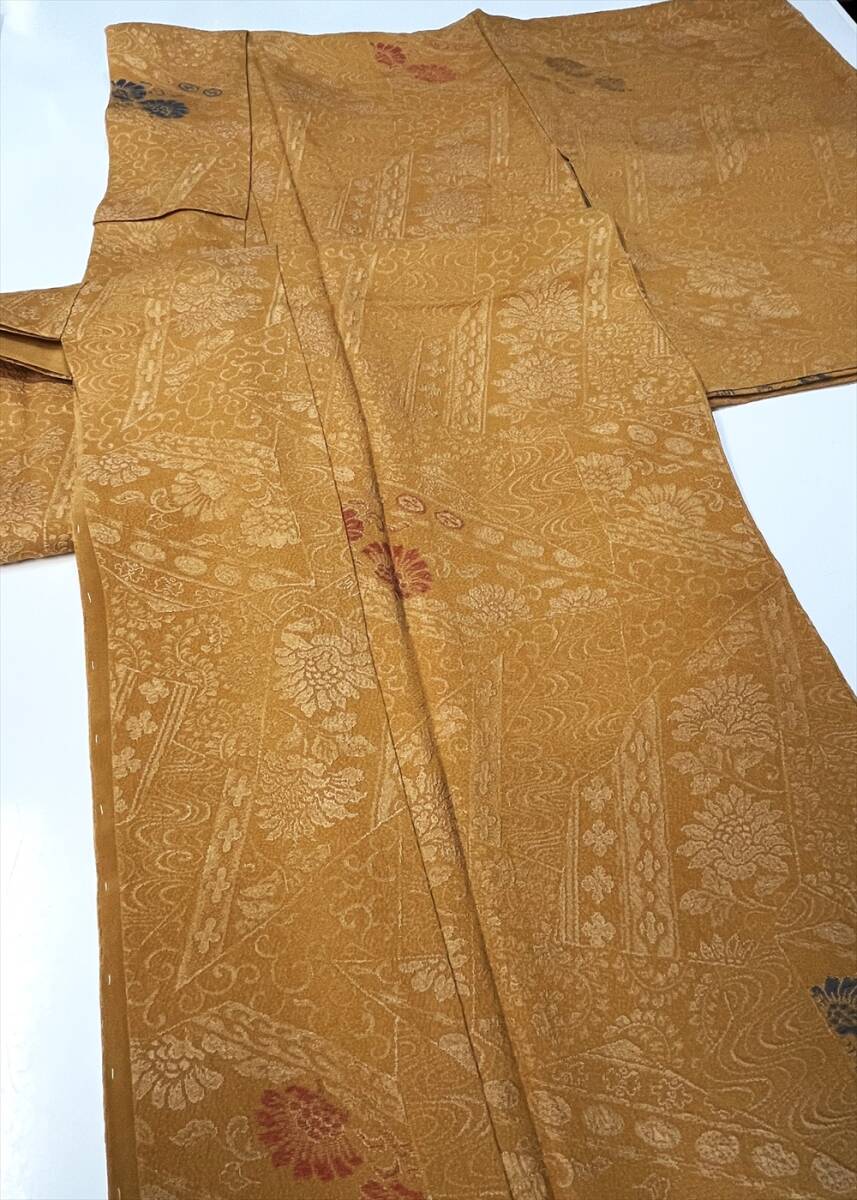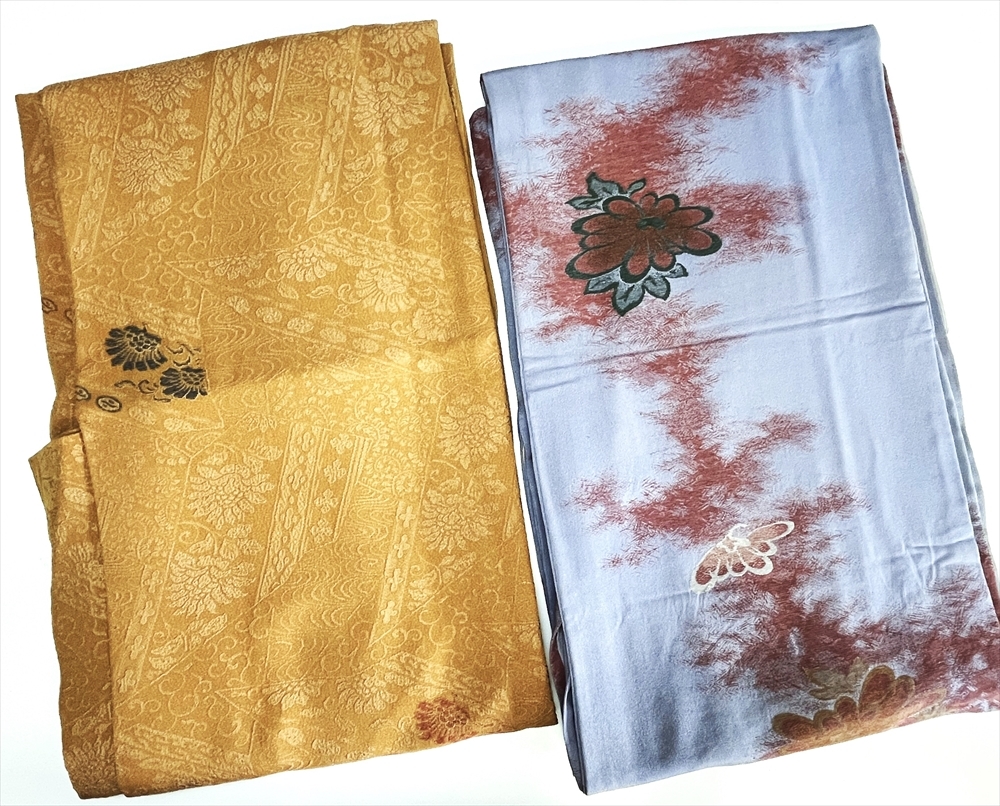 花とら●リサイクル着物 お召 2枚まとめて 芥子色 縫い取りお召 無地 漆 灰青紫 青灰 菊 金属糸    240402