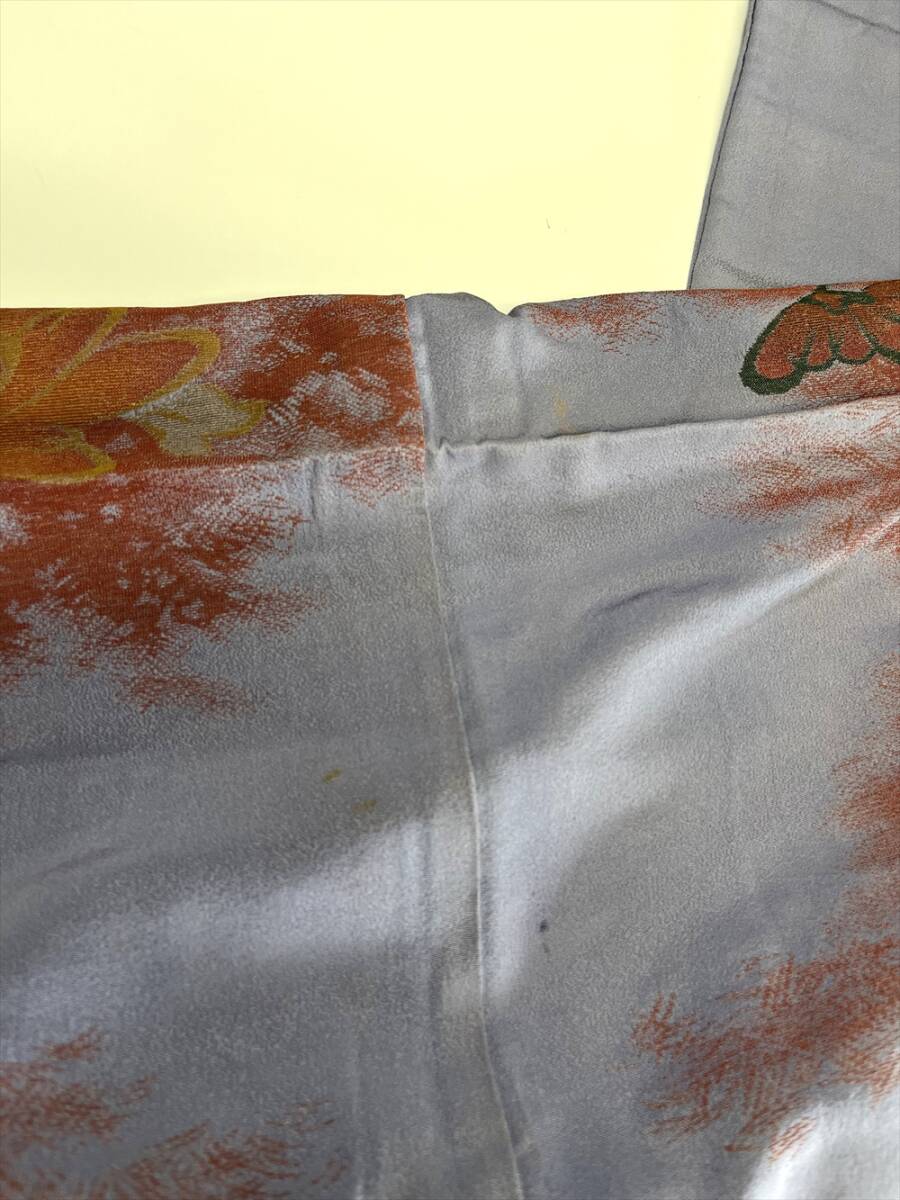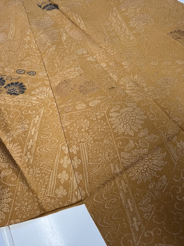 裾に茶のシミがあり、背や裾に変色があります。胴裏のシミも激しめです。