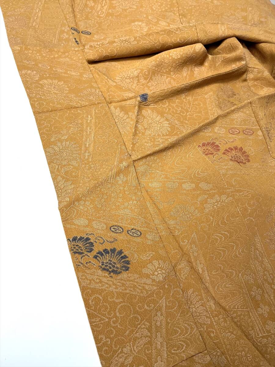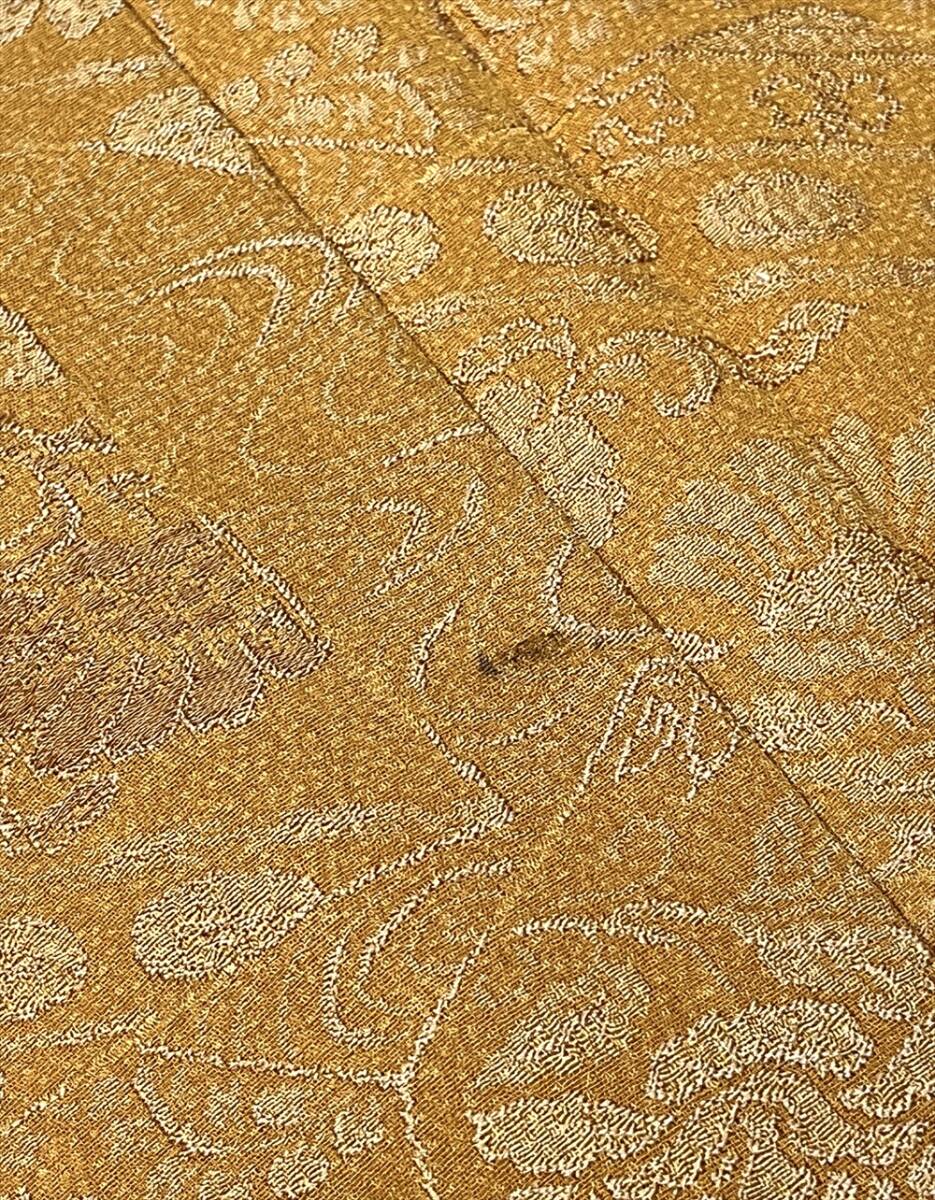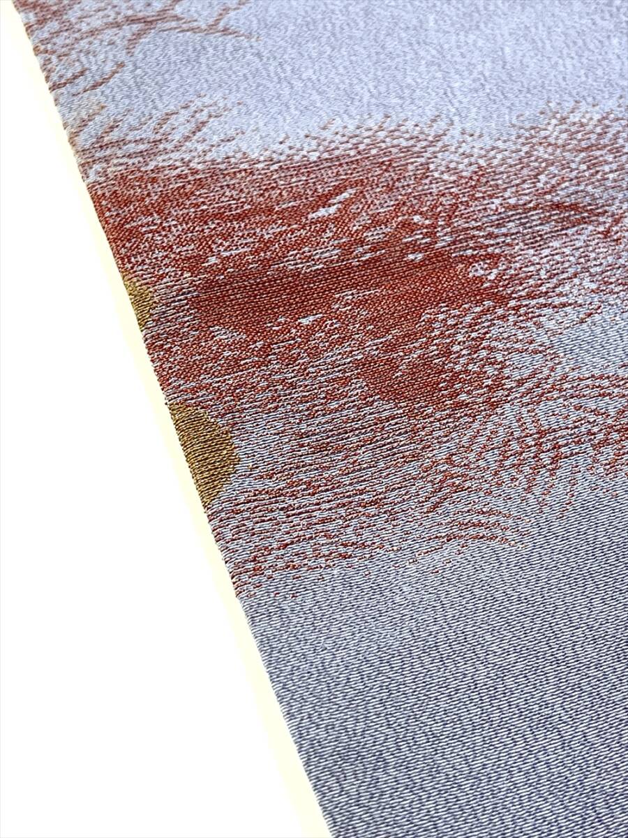 赤系の金属糸でモヤの感じを、漆箔や金属糸で菊が織り出されています。