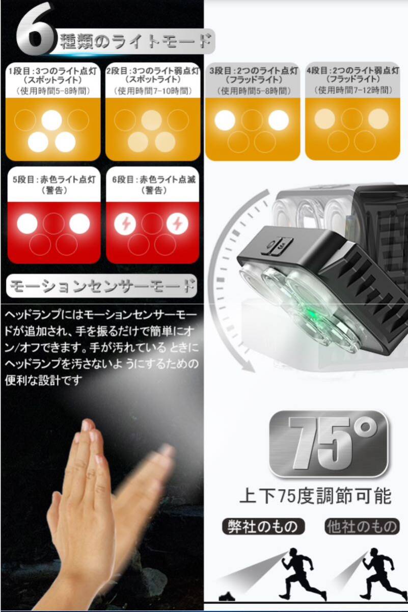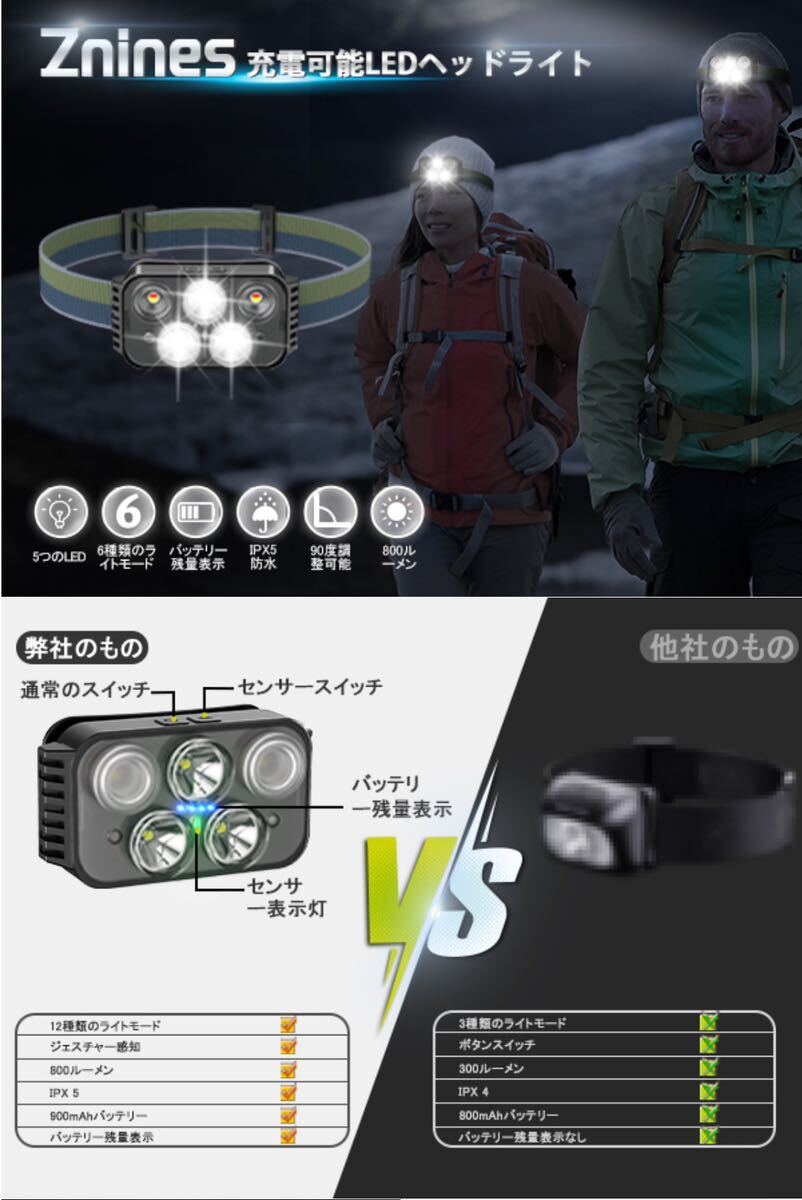 ヘッドライト USB充電式 【2024業界 新デザイン】 高輝度 LED ヘッドライト 赤&白ライト ジェスチャー検知 900mAhのバッテリー 登山 キャンプ 散歩 作業 釣り アウトドア 災害 SOS点滅 頭につけ ヘッドランプ 防水防塵 90°角度調整可 夜釣り