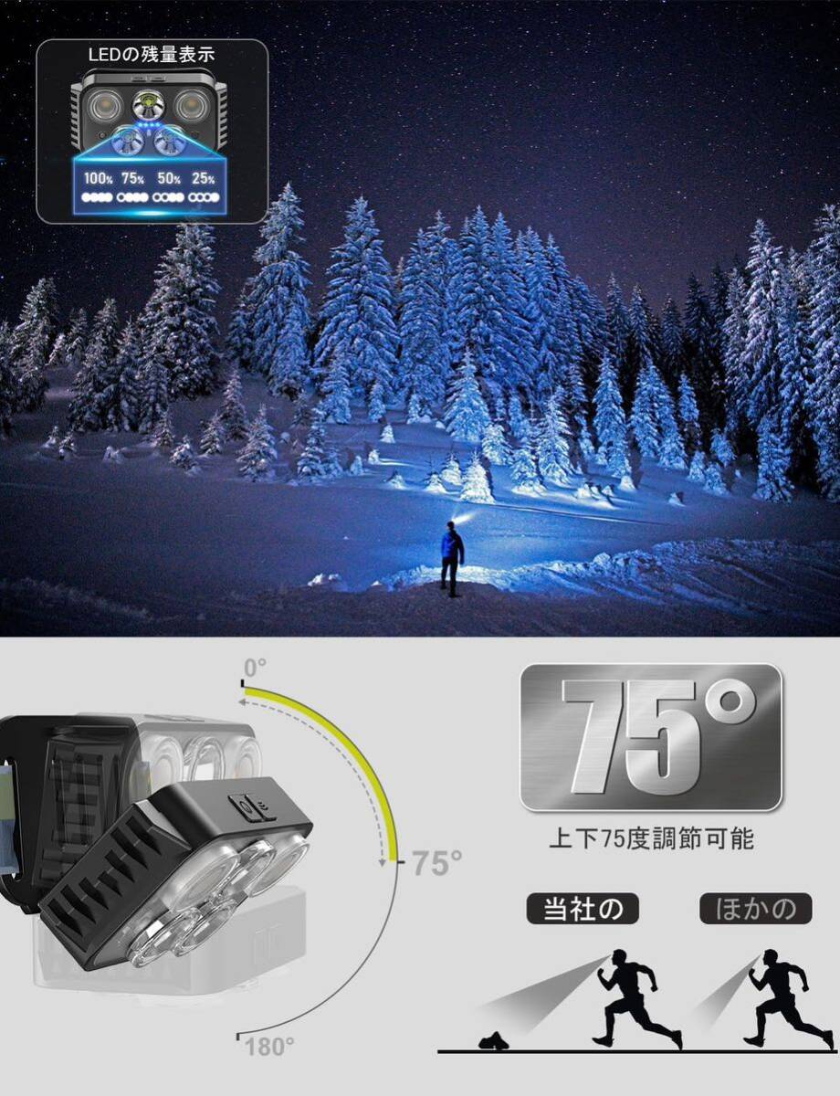 超高輝度&再充電可能:ヘッドランプは業界新デザインLEDチップを採用しており、 最大輝度は800ルーメンに達し、テント全体や道路を簡単に照らし出します。 900mAhの強力な充電式バッテリーを搭載しており、充電とライトの使用を同時に行うことができます。 充電が完了するのを待つ必要はありませんし、バッテリーを交換する必要もありません。 バッテリー残量表示機能があり、バッテリーの使用状況を把握するのに役立ちます。 (フル充電で5〜12時間持続)