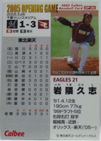 カルビープロ野球カード2005年OPENINGGAME OP-06【岩隈 久志(東北 楽天ゴールデン イーグルス)】平成17年チップスおまけ食玩【中古】送料込