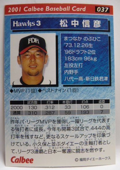 カルビープロ野球カード2001年#037【松中 信彦(福岡ダイエー ホークス)】平成13年チップスおまけ食玩トレーディングカード【中古】送料込