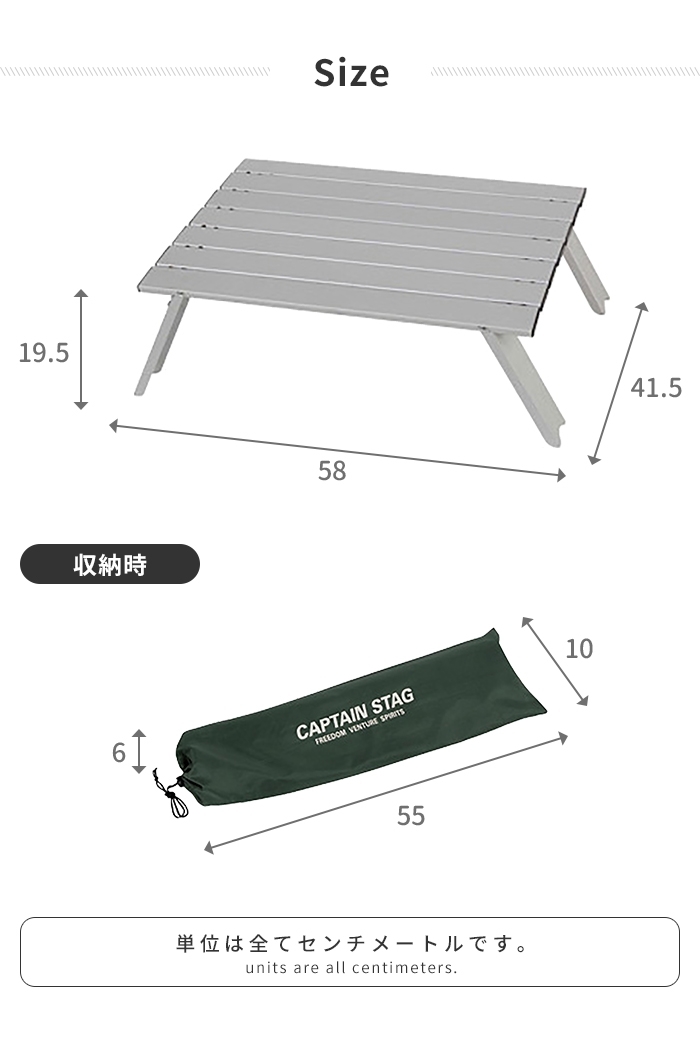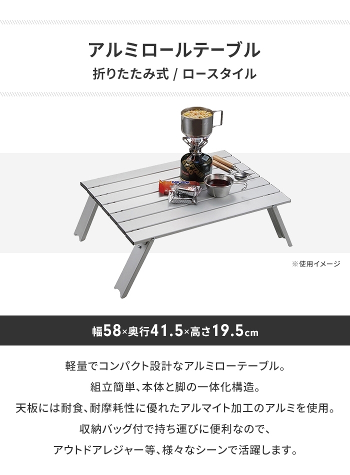 ロールテーブル アルミ アウトドア コンパクト 幅58 奥行41.5 高さ19.5 シルバー ロースタイル 折りたたみテーブル 収納 収納バッグ付き キャンプ テーブル 折りたたみ 耐荷重30kg アルミ製 ローテーブル 収納テーブル コンパクトテーブル レジャーテーブル アウトドアテーブル キャンプテーブル 机 簡易テーブル おしゃれ シンプル アウトドア テント アウトドア用品 キャンプ用品 レジャー用品 作業台 調理台 サブテーブル マルチテーブル 釣り 海 川 フェス BBQ バーベキュー用品 携帯折りたたみテーブル つくえ 運動会 グランピング用品 バーベキュー ベランピング 持ち運び 行楽 旅行 花見 ソロキャンプ 遊び 折り畳み 折りたたみ式 |
