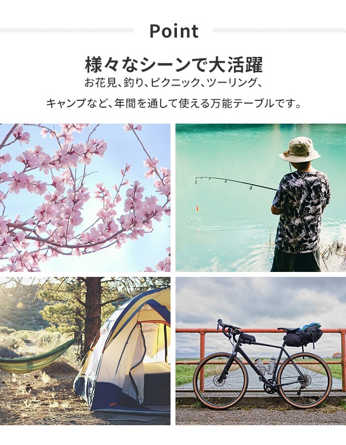 軽量コンパクト設計、お花見、釣り、ピクニック、ツーリングに最適。 組立簡単、本体と脚の一体化構造。 天板には耐食、耐摩耗性に優れたアルマイト加工のアルミを使用。 収納バッグ付で持ち運びに便利。 焚き火などのロースタイルシーンではサイドテーブルとしても活躍。 |