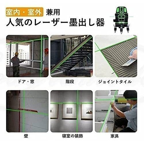 • 【高輝度・高出力・高機能】4本垂直線、1本水平線、地墨ポイントの構造ですので、明るい環境でも視認性の高いラインを照射します。普通3ラインより精度・輝度が高いです。 OUTのボタンを押すと屋内・屋外モードに切り替わり、作業環境に合わせたラインを簡単に切り替えできます。水平ライン・垂直ライン・クロスラインなどで墨出しや大矩(直角)が効率良く出せます。レーザー安全基準:クラス2 出力:1mW以下