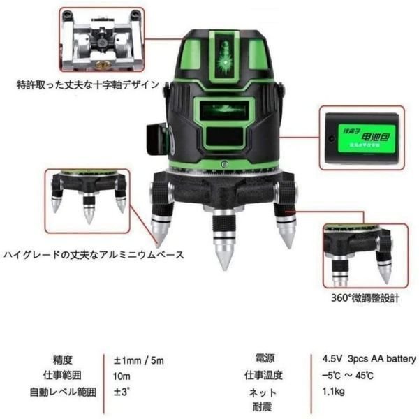 • 【特徴】明るい環境でもラインを探しやすい構造。鮮視度300のくっきりライン。360度回転微調整機能付で、本体がどの向きでも精密な地墨合わせが可能。高品質設計で、現場で測定に使いです。