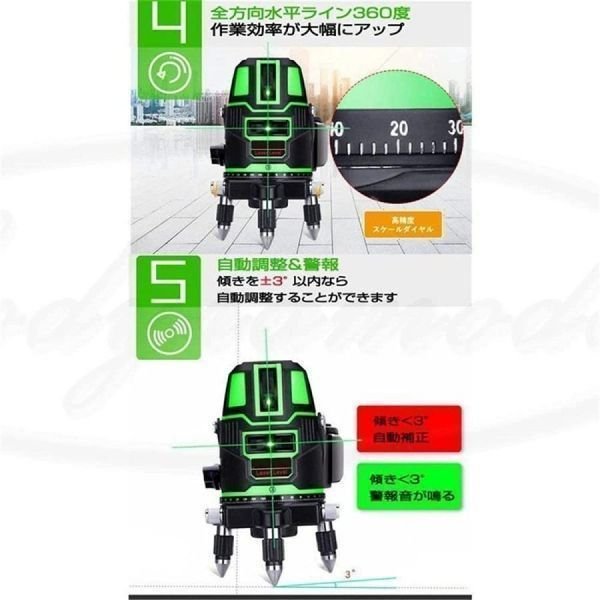 • 【傾斜モード】振り子式を採用、傾斜角度が3°以上,斜数秒後レーザー光が自動消灯し、 傾斜警告ブザーの音が鳴ります。