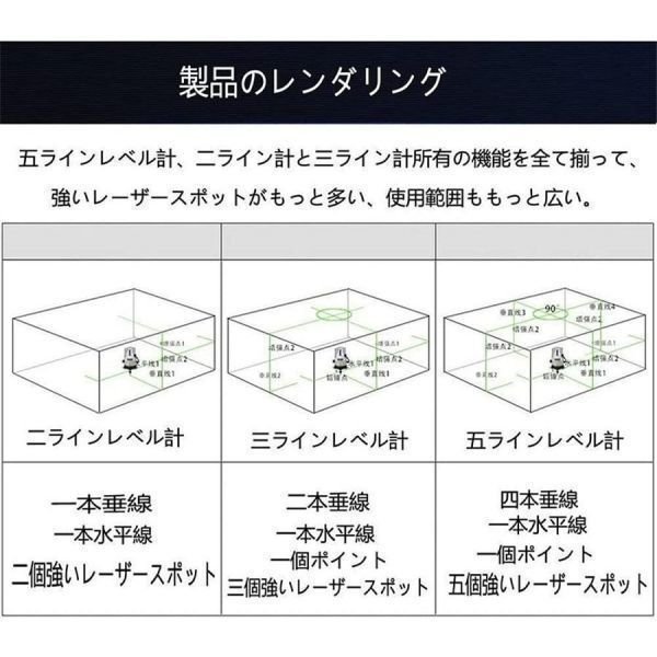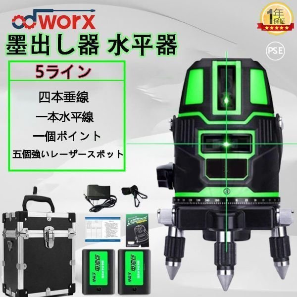 グリーンレーザー 墨出し器 5ライン 6点 フルライン 4方向大矩照射モデル 高精度 光学測定器 電池*2建築 基礎 レーザー墨出し器
