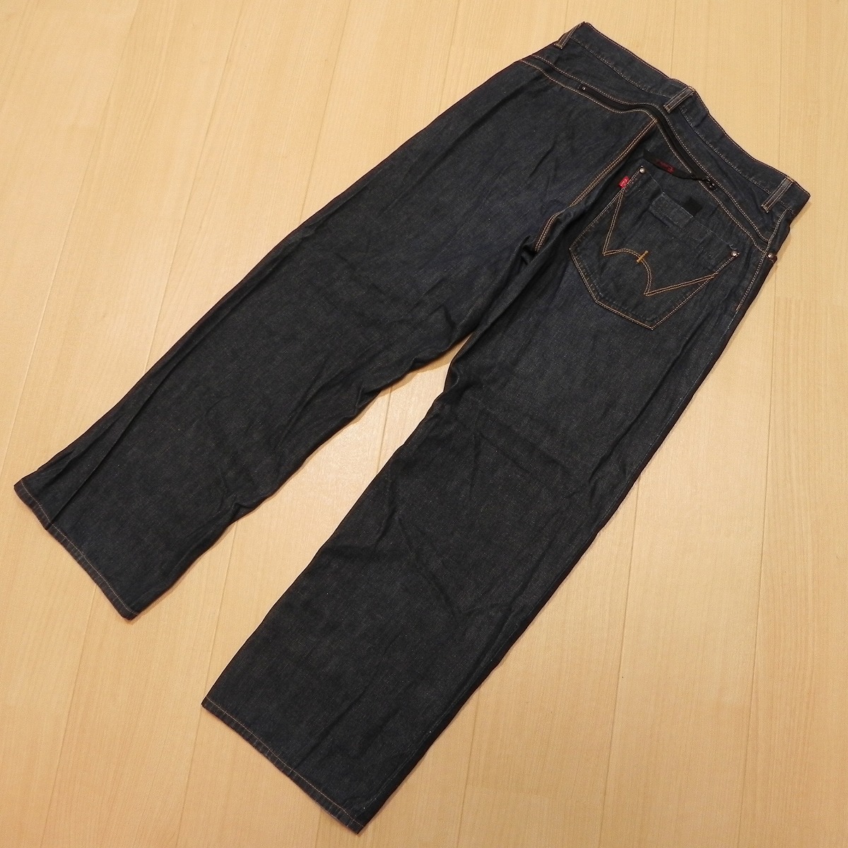 ●あくまでも古着のため、ノークレームノーリターンでお願いいたします。使用感はございますが、とくにダメージございません。通常のデニム地よりも薄手のライトオンスデニムです。色も濃いめですので、活躍すると思います。 裾はシングルステッチで裾上げされております。