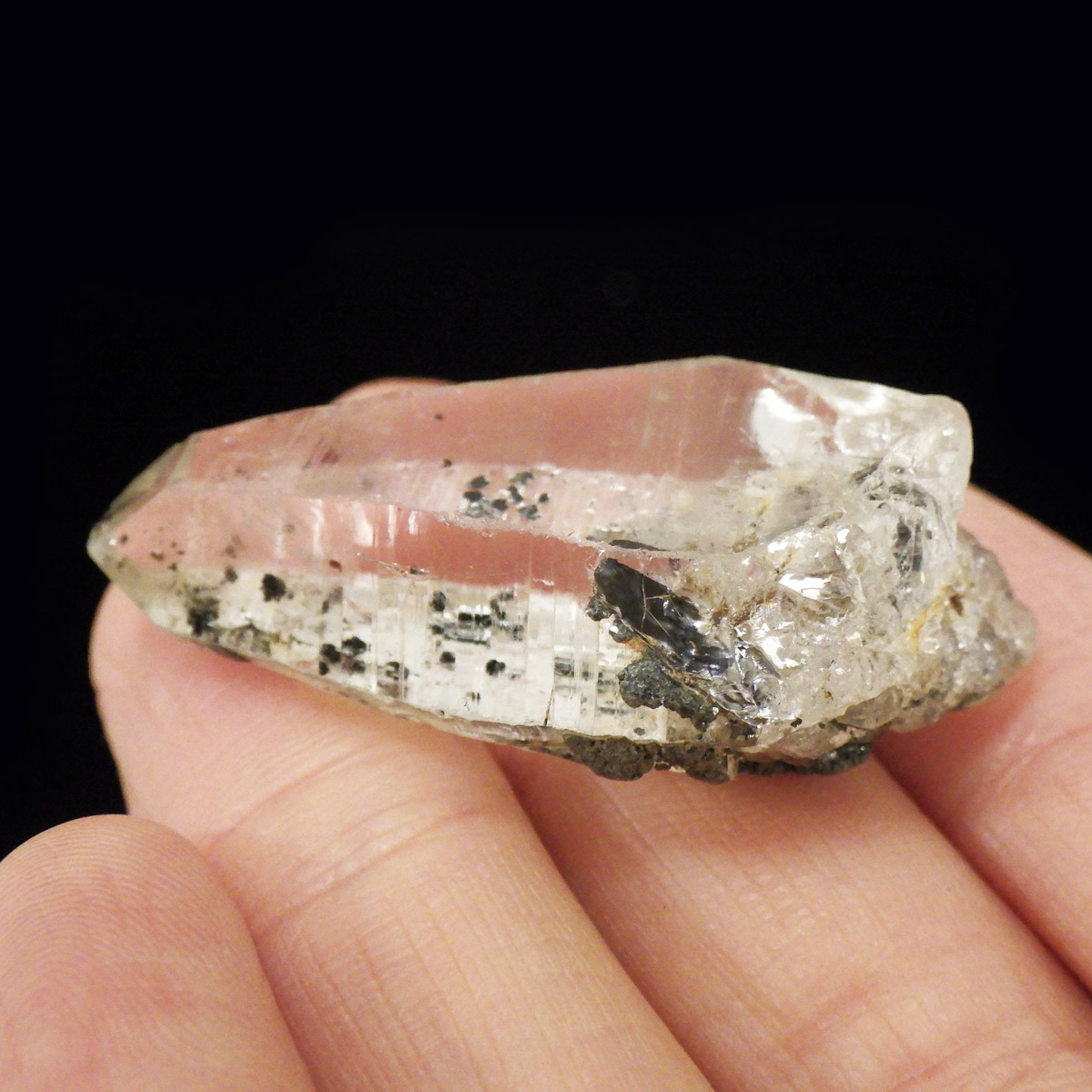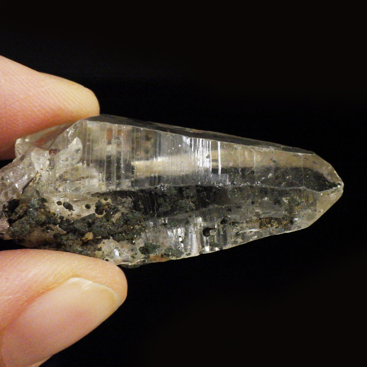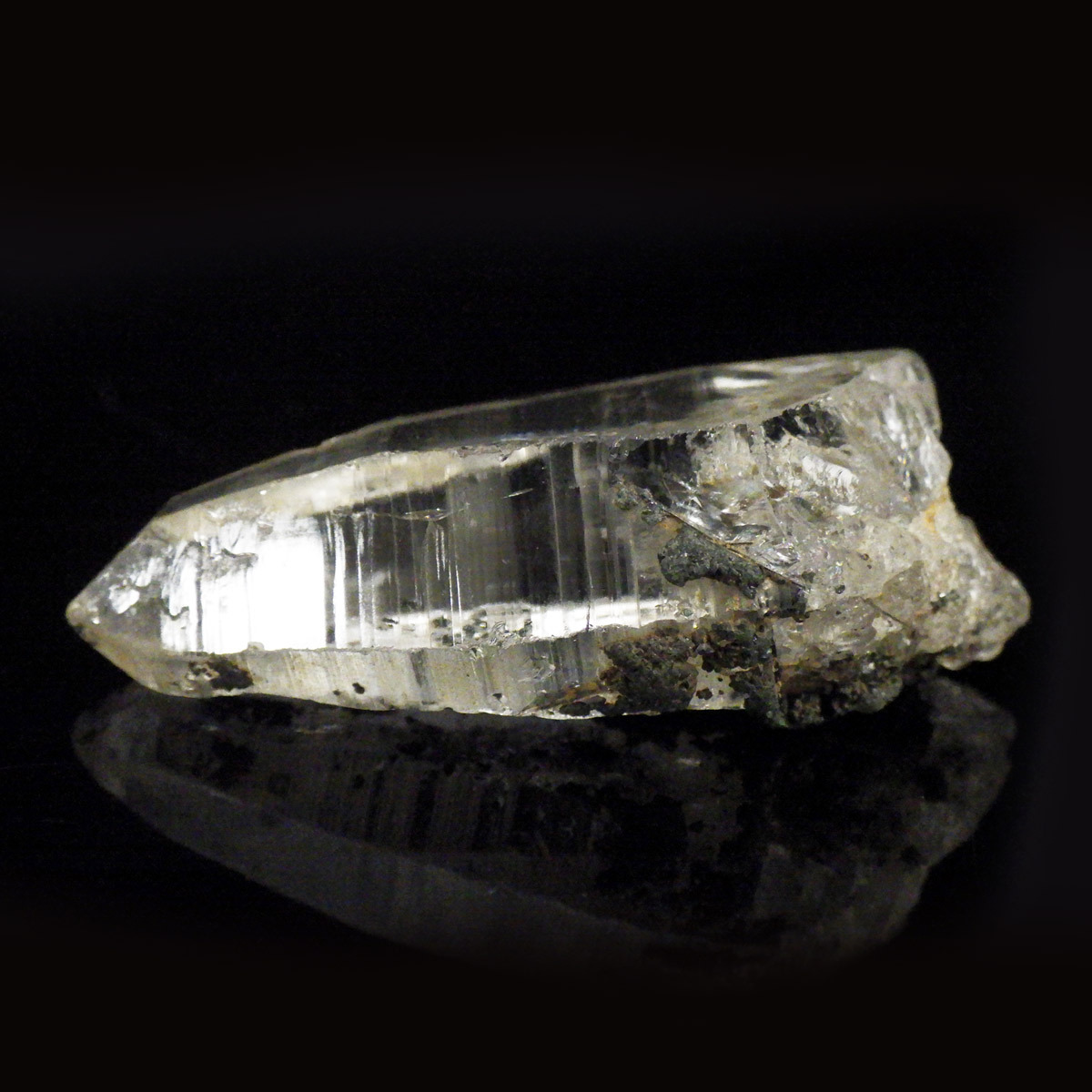 ネパールのガネーシュヒマール産水晶は「ぬめり」と表現される、水にぬれたような独特な光沢が特長です。ガネーシュヒマールとは、ネパール東端に位置する山の名前です。透明度も大変高く、クッキリと背景が透けて見えます。表面にはバーコード状の成長線が入っています。透明の結晶は本当に美しいです。エッジの効いたシャープな姿も魅力的です。