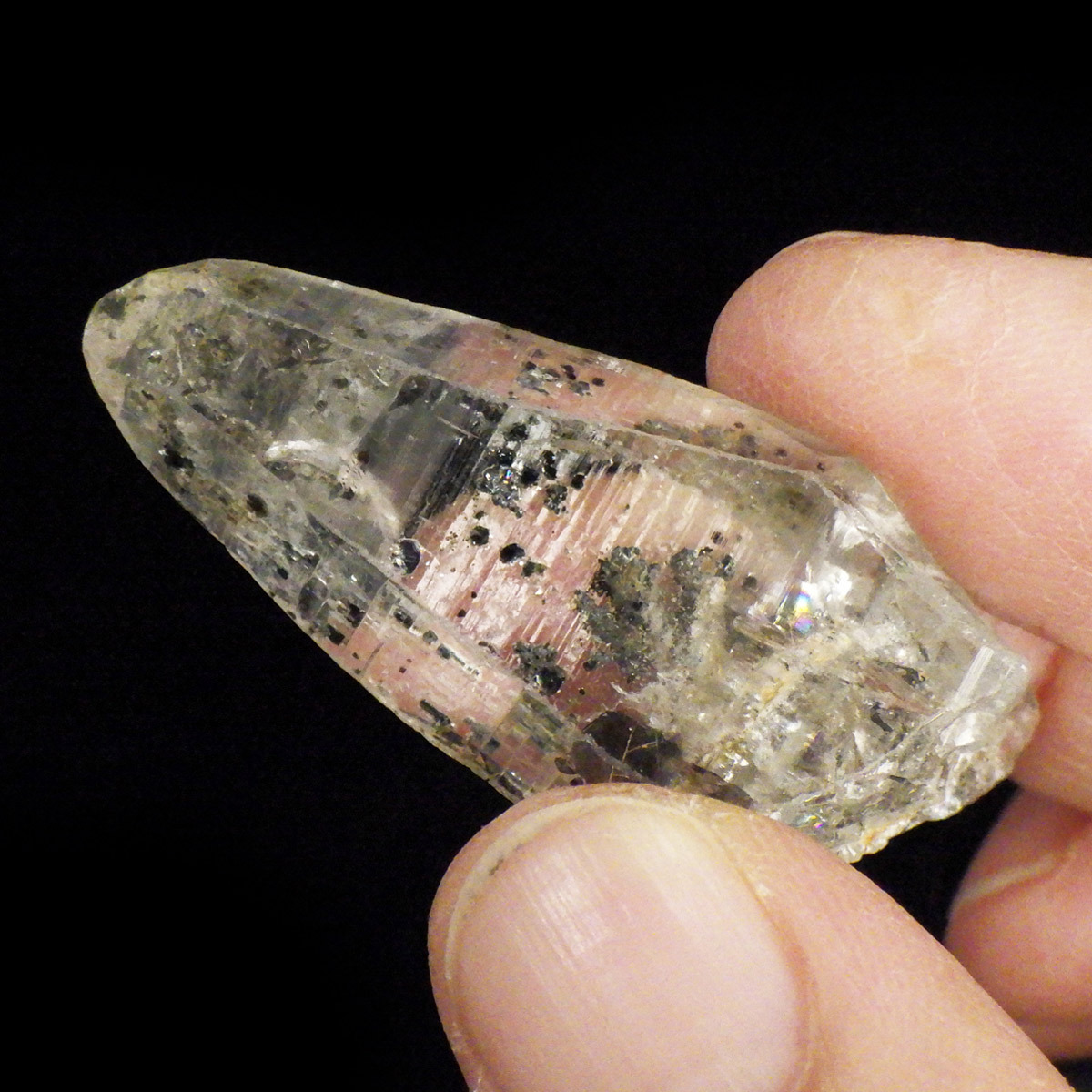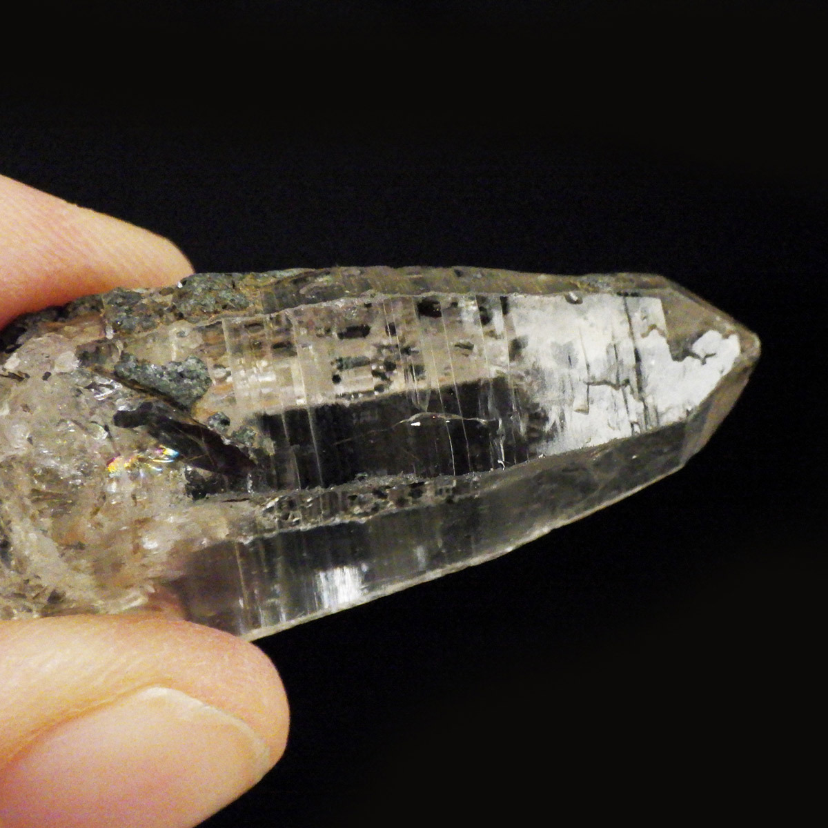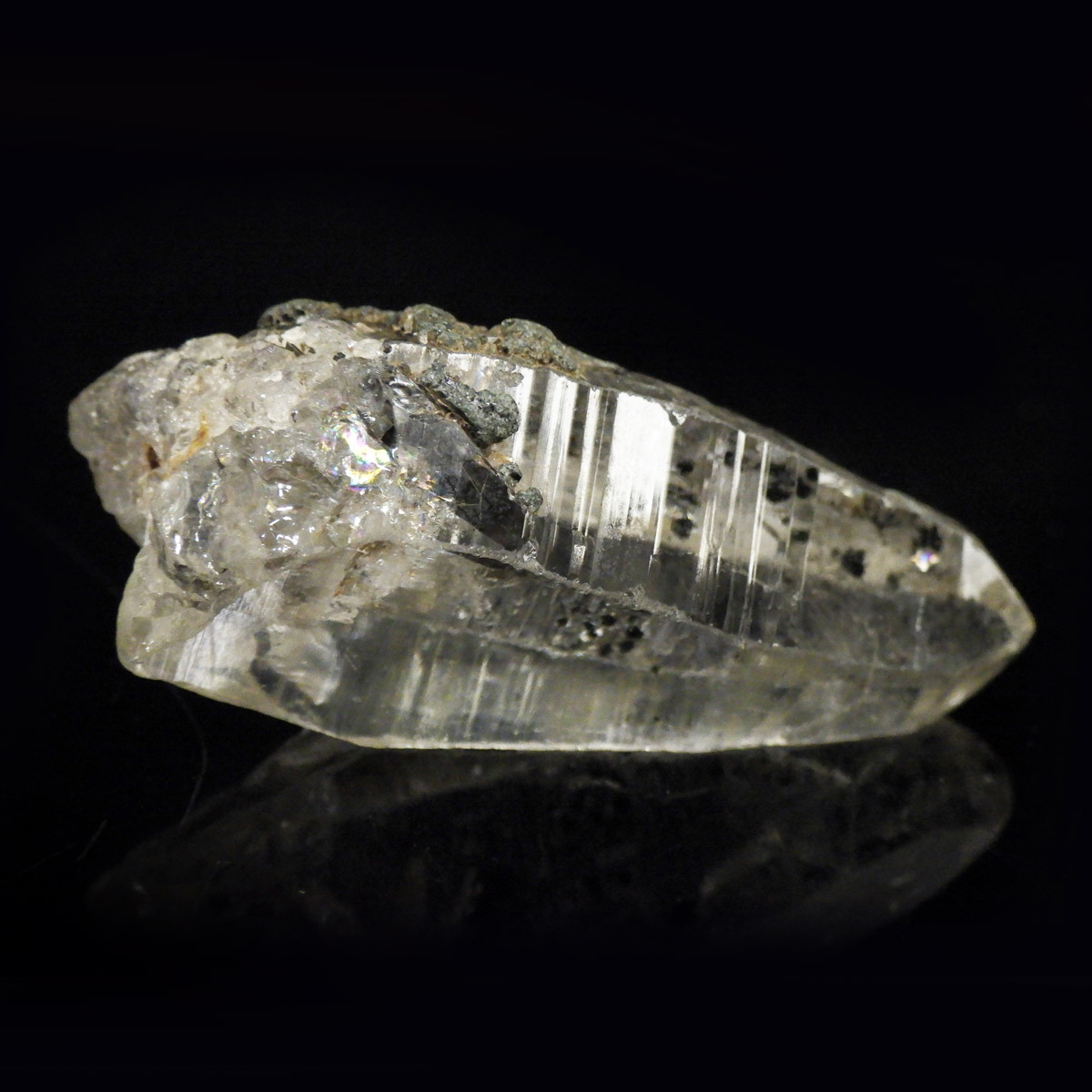ネパールのガネーシュヒマール産水晶は「ぬめり」と表現される、水にぬれたような独特な光沢が特長です。ガネーシュヒマールとは、ネパール東端に位置する山の名前です。透明度も大変高く、クッキリと背景が透けて見えます。表面にはバーコード状の成長線が入っています。透明の結晶は本当に美しいです。エッジの効いたシャープな姿も魅力的です。