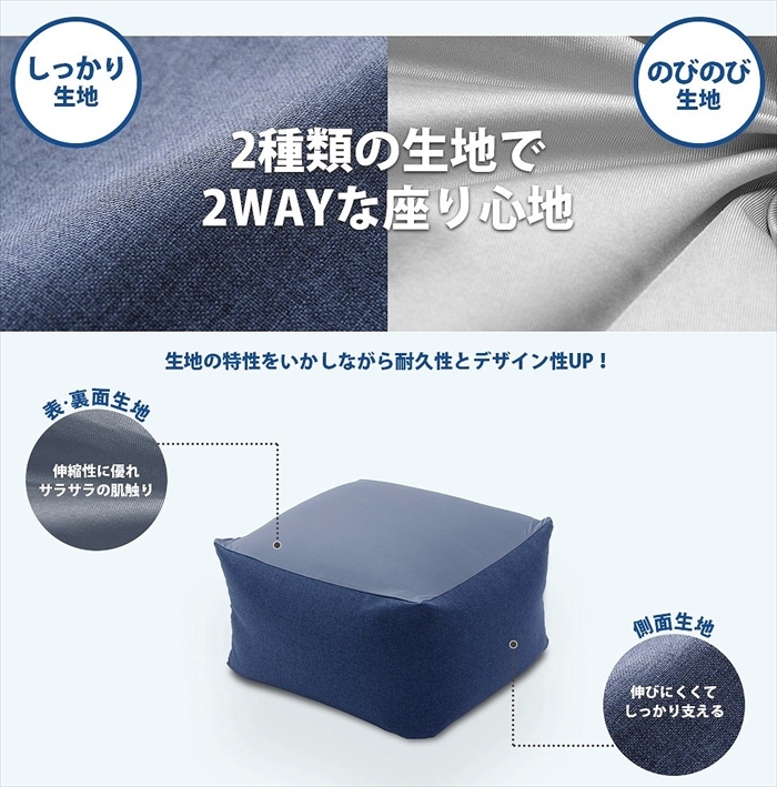 | 極小ビーズを使用した日本製のビーズクッション。 カバーリングタイプで洗濯ができます。 ※アッシュグレーとインディゴブルーのスティチ生地(伸びる生地)は同色のグレーの生地です。 |