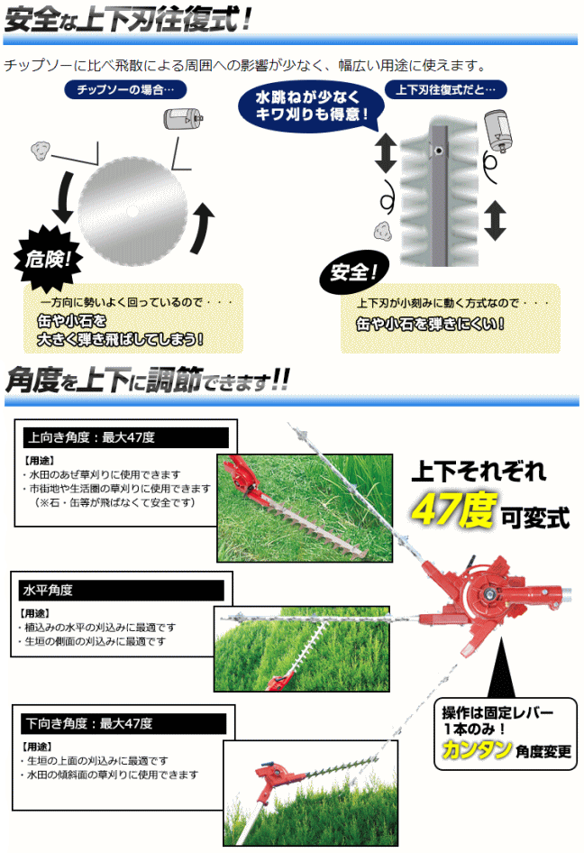 | 機能・特徴 | ・安全な上下刃往復式で、チップソーに比べ飛散による周囲への影響が少なく、 幅広い用途に使えます。 ・障害物の際までスッキリ草刈り作業ができます。 ・刃は高級刃物鋼を使用し、切れ味の良い3面研磨処理を施しており、また、 無電解ニッケルメッキ仕上げによりヤニやサビに強い刃になっています。 ・5種類のソケット付でほとんどの草刈機に簡単に装着できます。 ・固定レバー1本のみの簡単な操作で、角度を上下に調節できます。 |