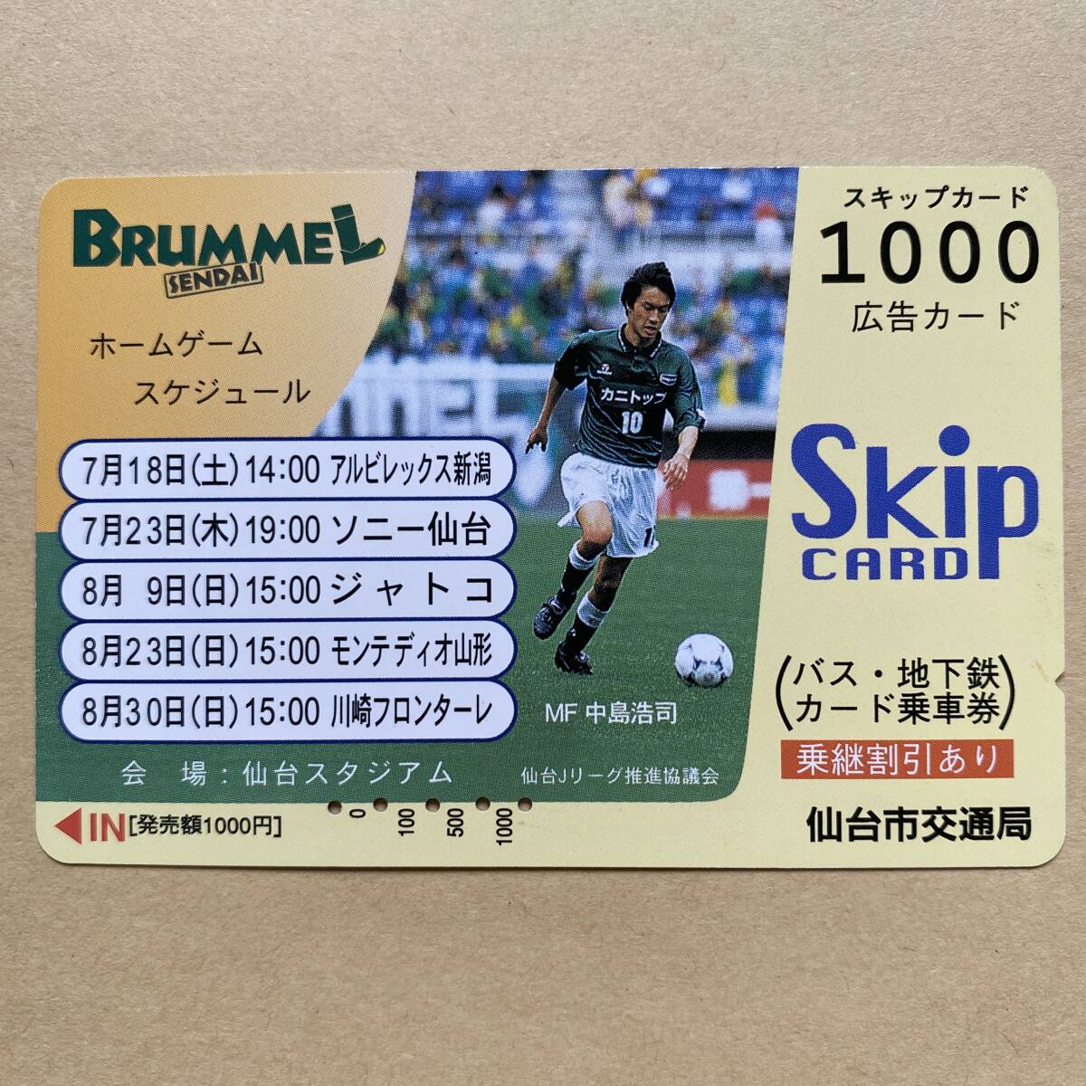 【使用済】 サッカースキップカード 仙台市交通局 ブランメル仙台 MF中島浩司