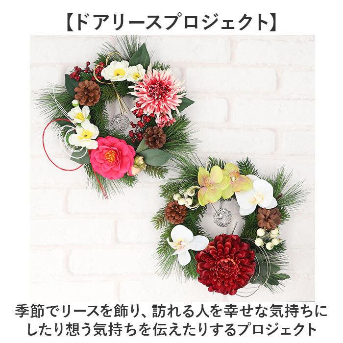 | 商品説明 | ・・【ドアリースプロジェクト】 ・季節でリースを飾り、訪れる人を幸せな気持ちにしたり想う気持ちを伝えたりするプロジェクト ・【ミックスでナチュラルさUP】 ・フェイクグリーンの中に本物の松ぼっくりを使用し、よりナチュラルな風合いに! ・【いつでも色鮮やか】 ・花や葉っぱの部分はフェイクグリーン♪長く色鮮やかな植物を鑑賞できるのがGOOD。 ・【シルバーのチャーム付き】 ・中央には「Door Wreath Project」のシルバーチャーム付き。 |