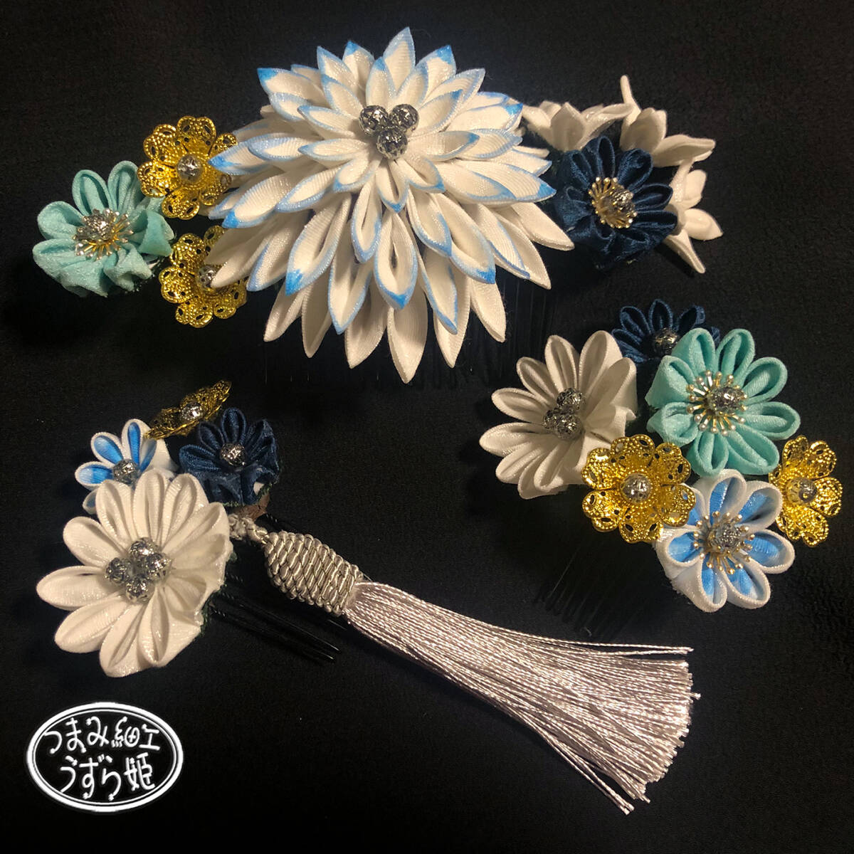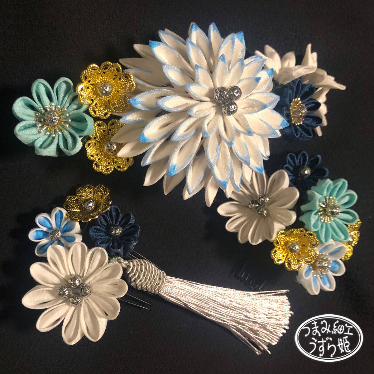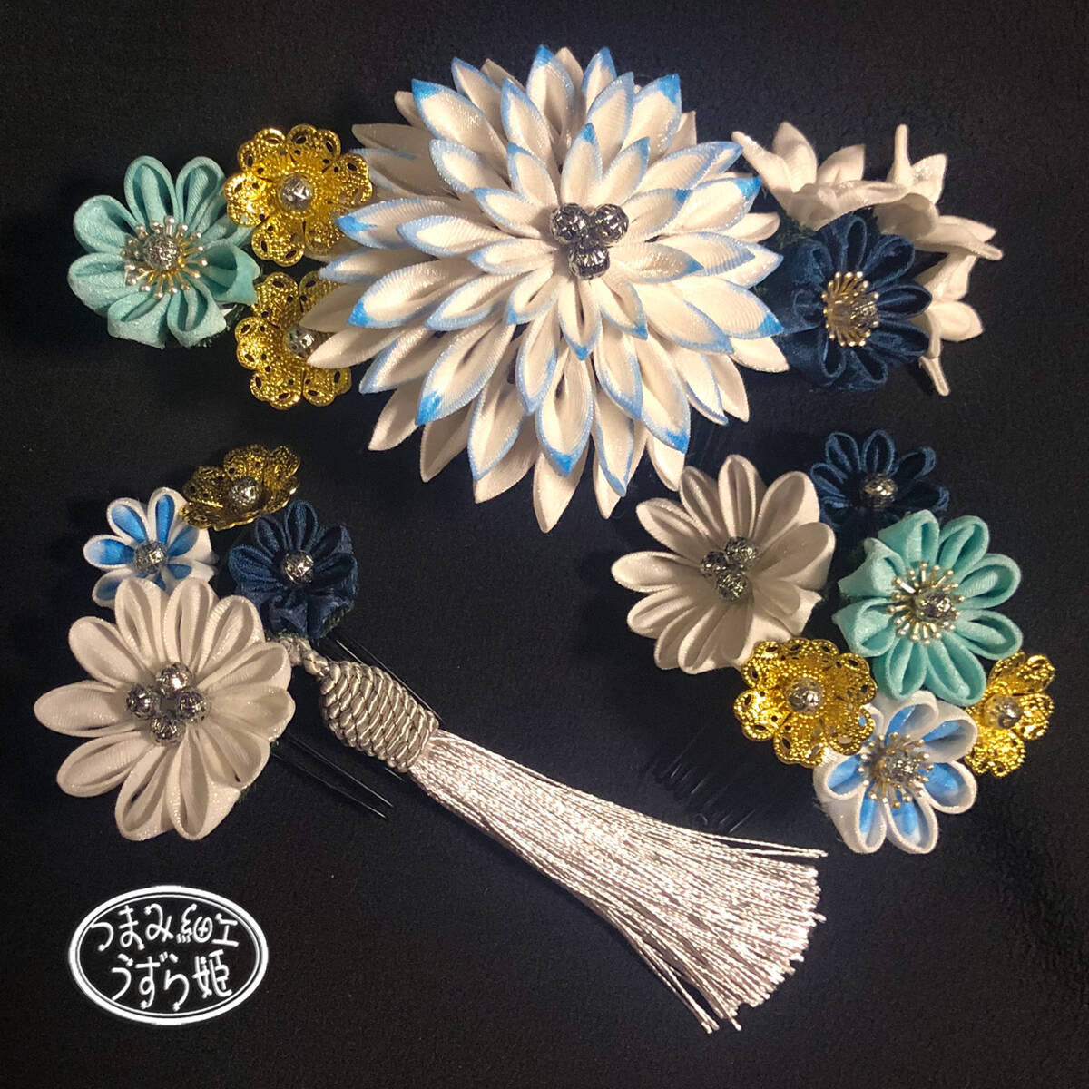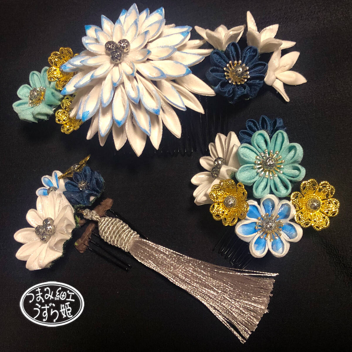 3点セット 青グラデーション 半クス剣菊と小菊のコーム かんざし つまみ細工