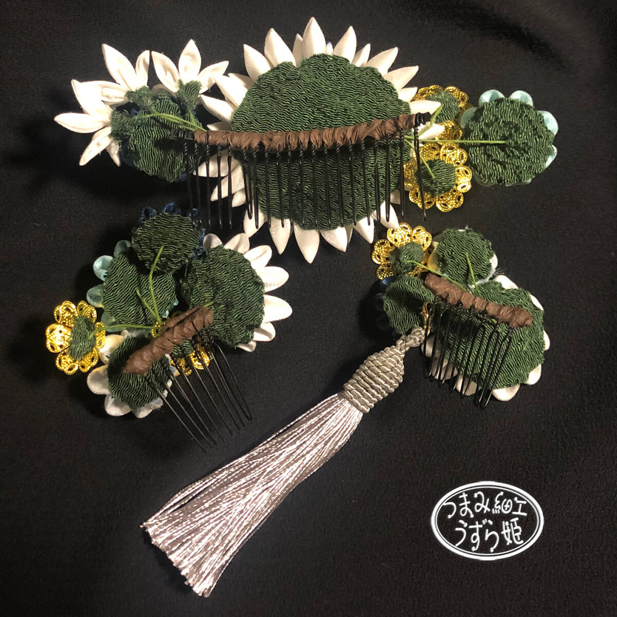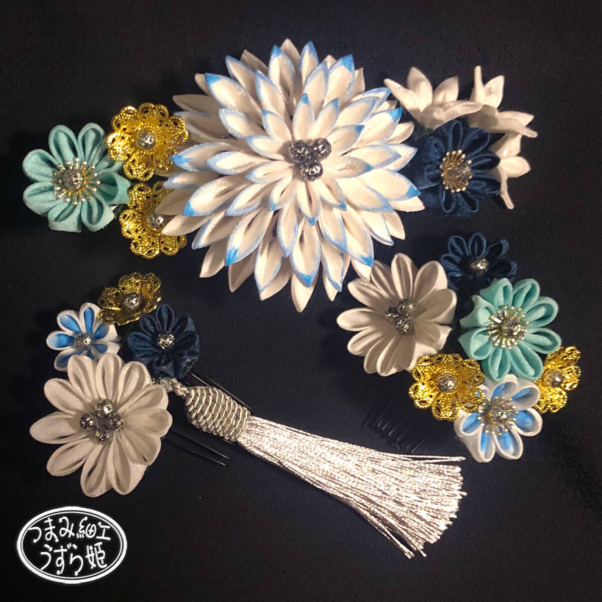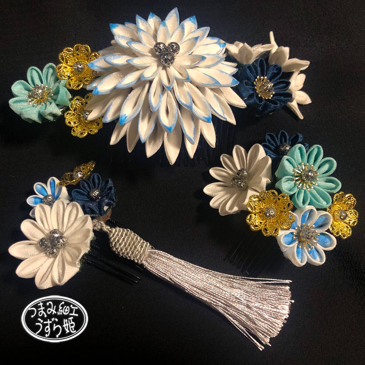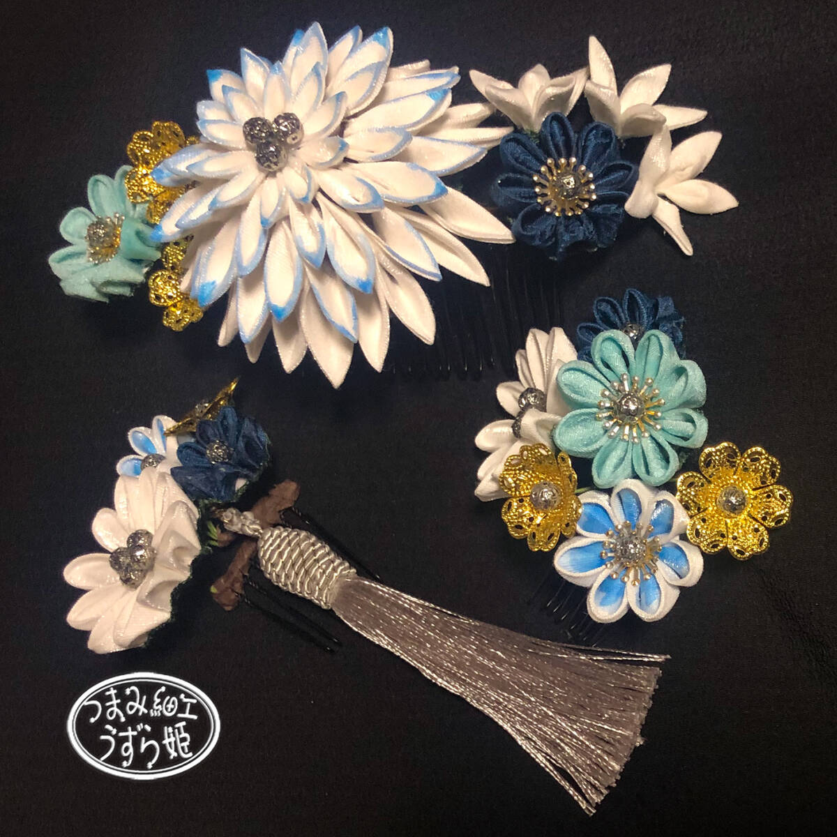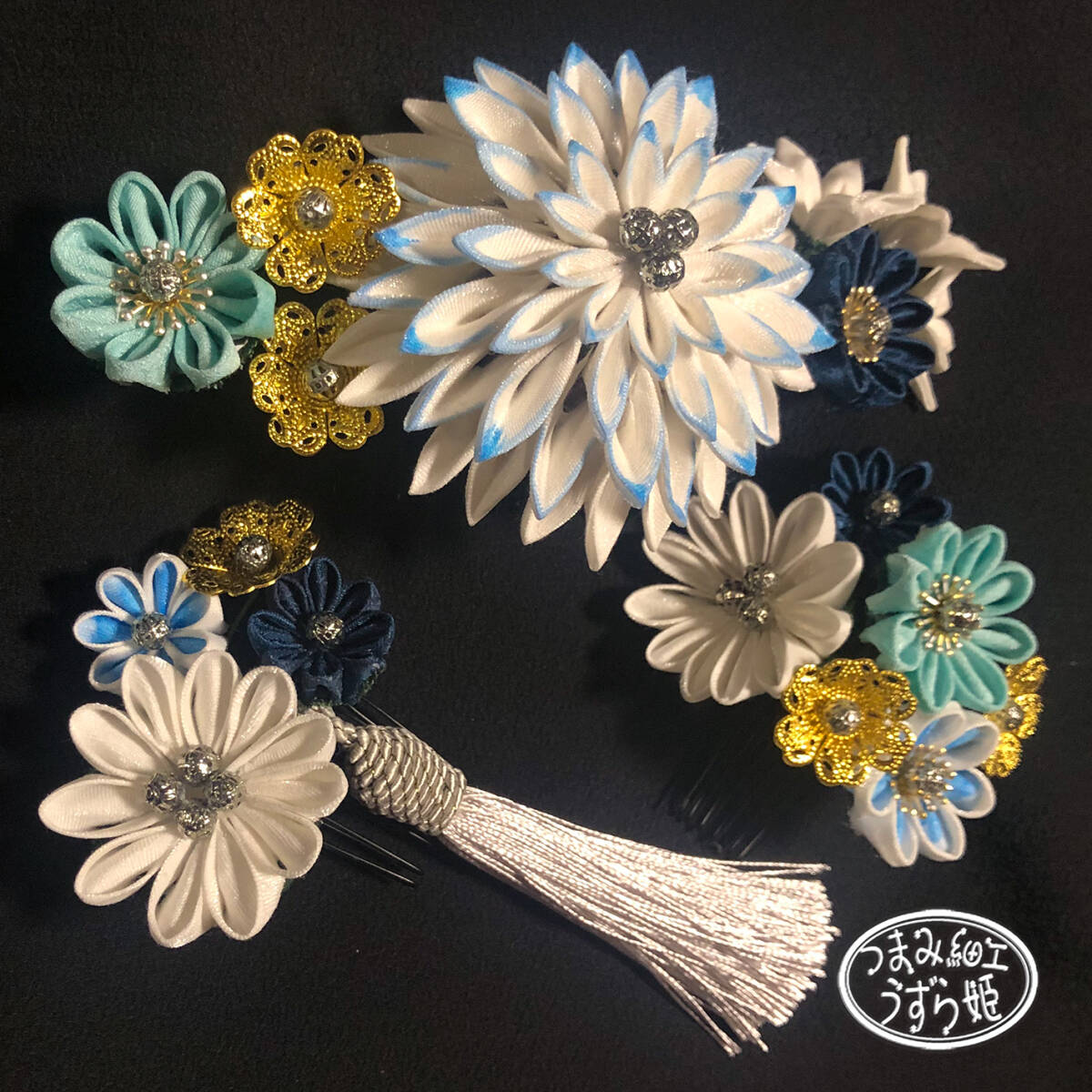 3点セット 青グラデーション 半クス剣菊と小菊のコーム かんざし つまみ細工