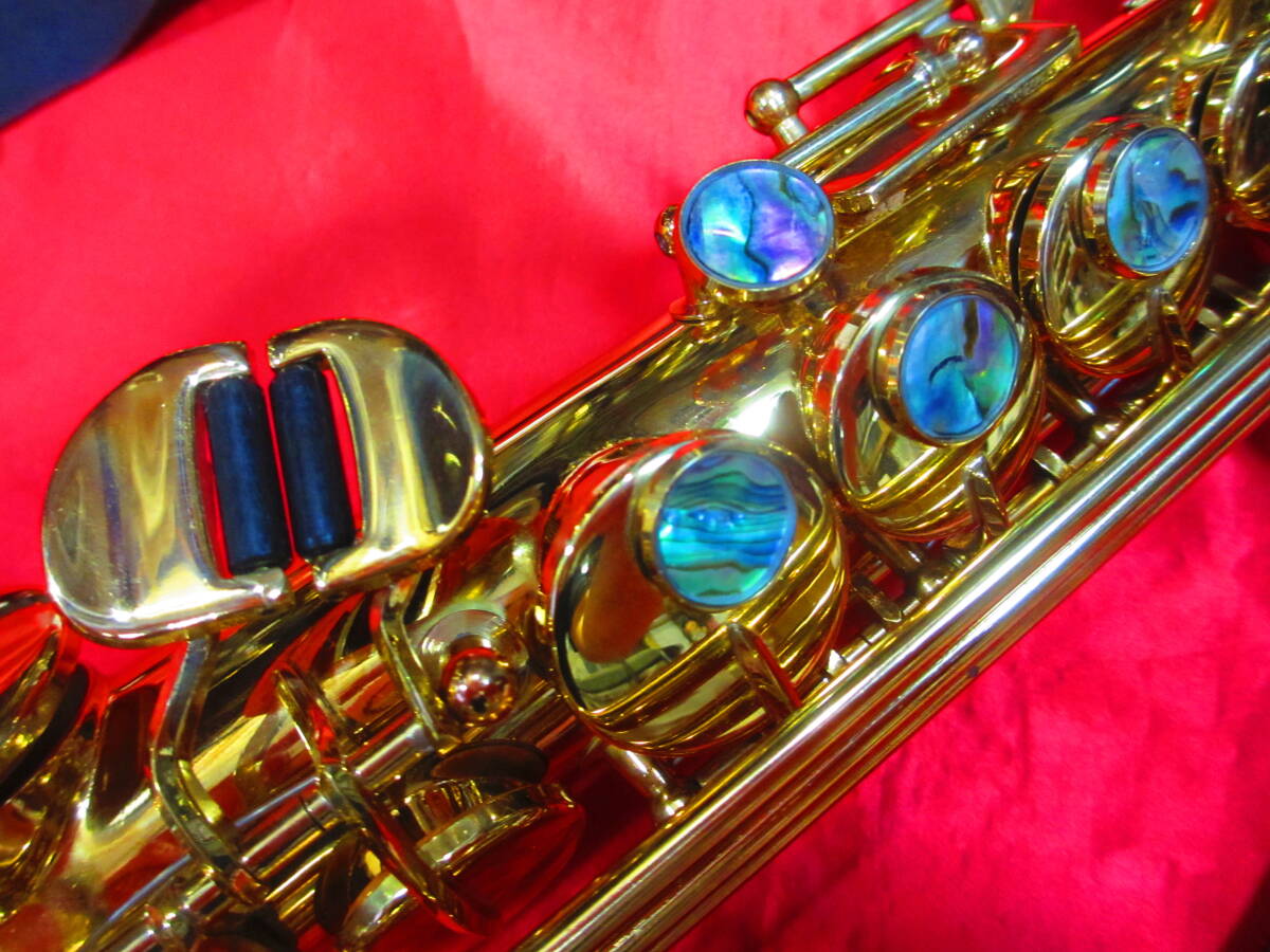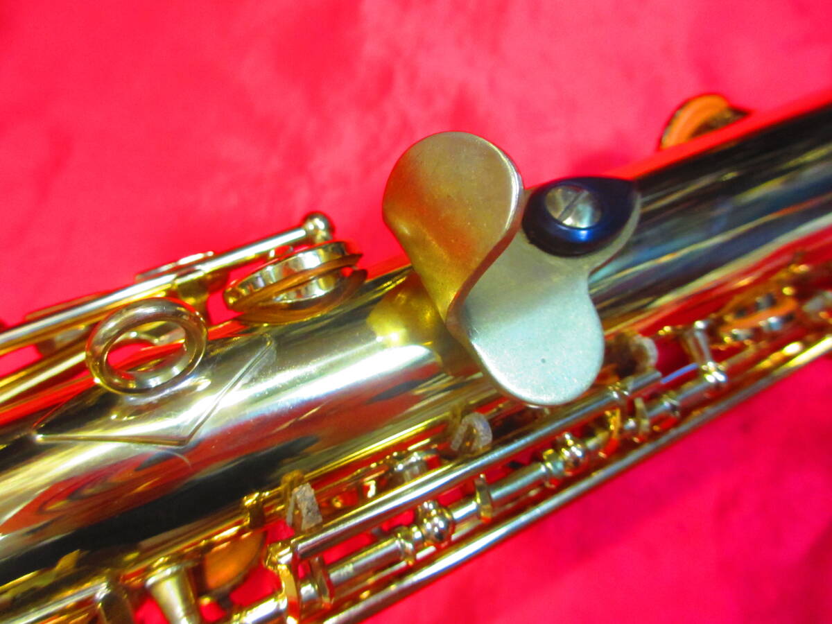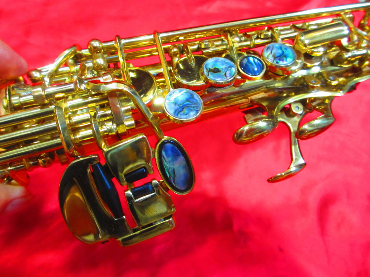 ・最後期の2ネックモデルを指貝アワビ・オリジナルワイドサムフックとカスタマイズし、その他キー高やスプリング調整を施し扱いやすいようキーをコンパクトに合わせた実戦向きなソプラノサックスです。スタジオ試奏、音程チェックしましたが、コントロールできる範囲での狂いでしたので、ビギナーから経験者の他楽器からの持ち替えにも対応出来る素直で吹きやすい個体です。オリジナルサムレスト装着の効果で元々ライトウェイトで細めのサウンドが太くパワフルに響くようなりました。